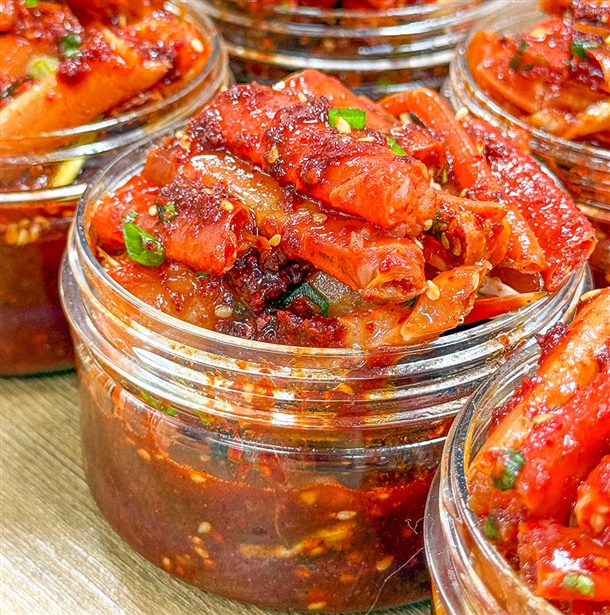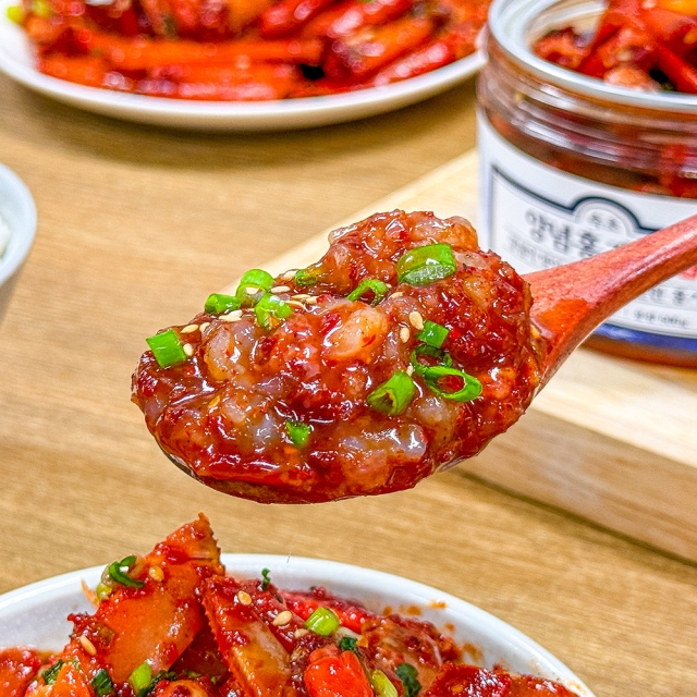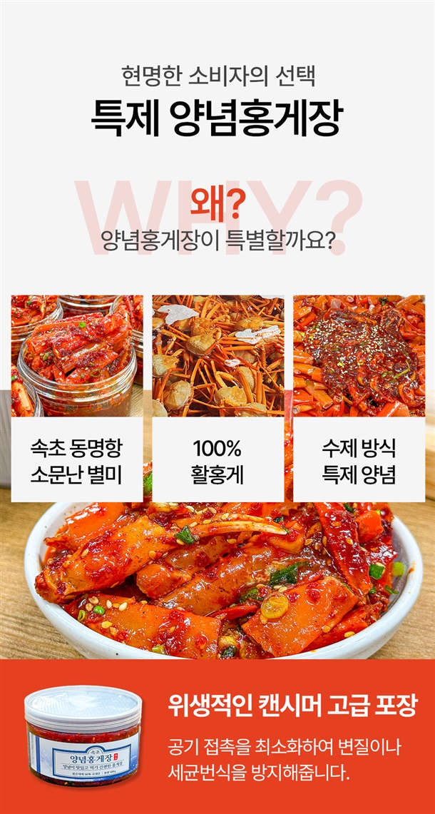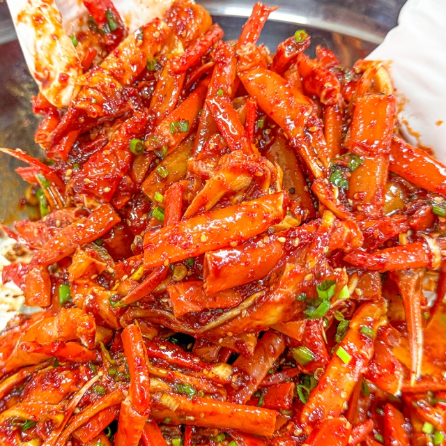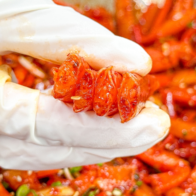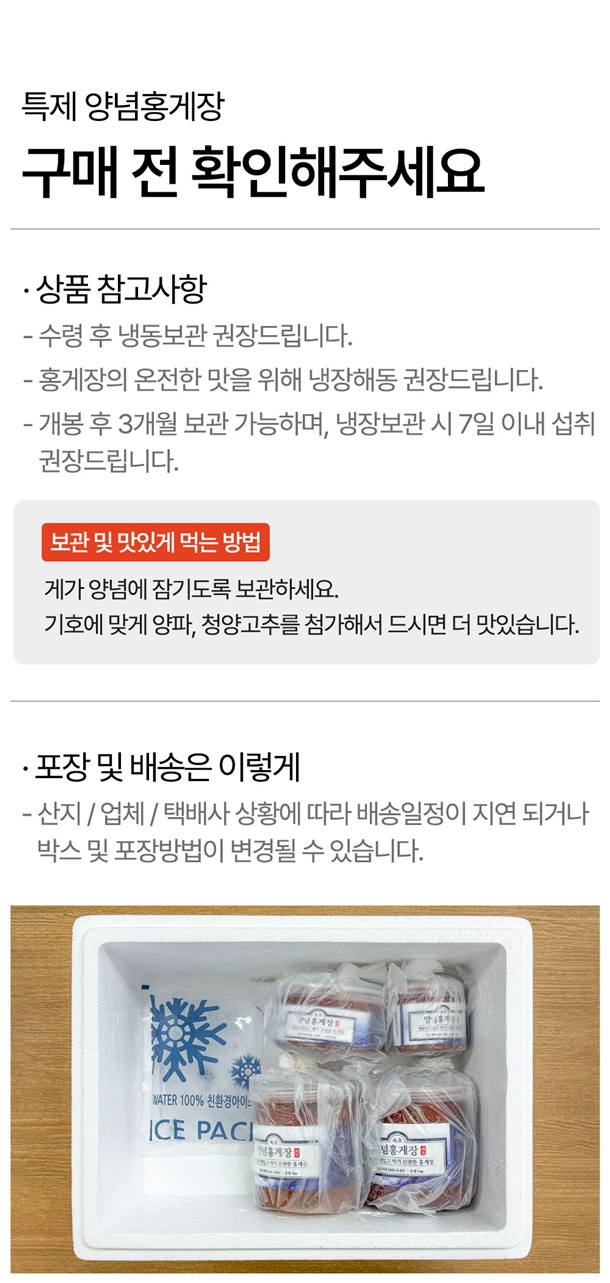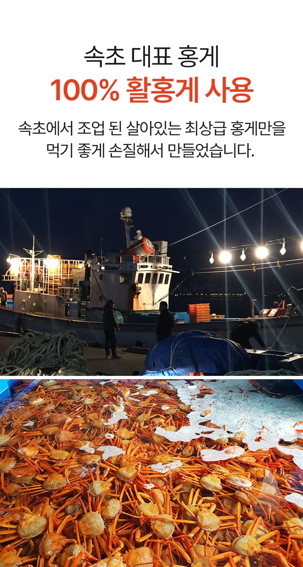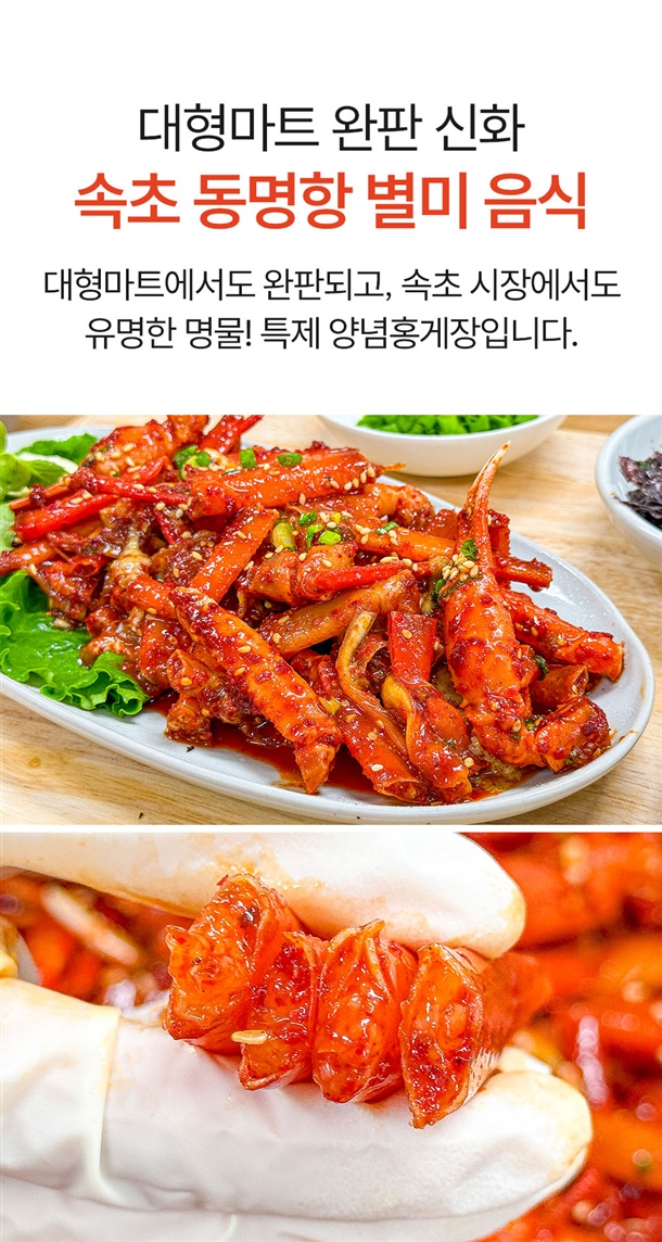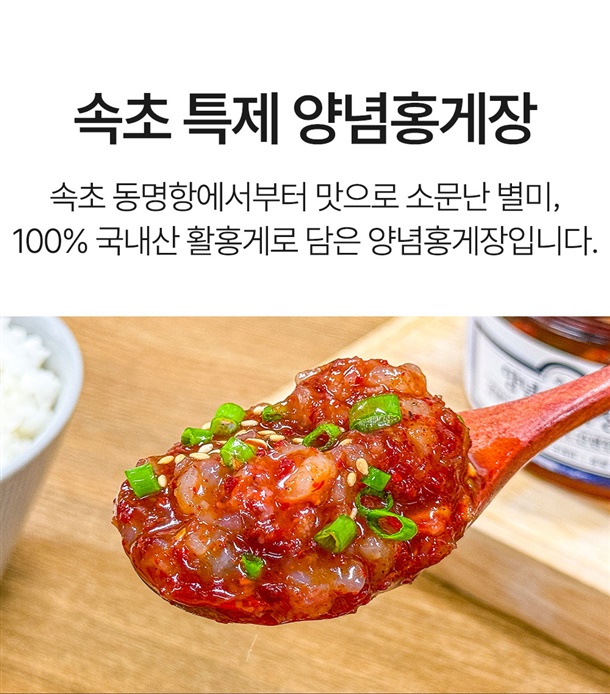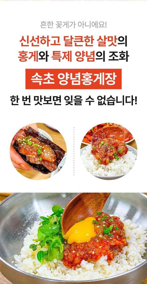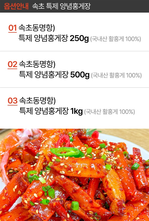붉은대게(국내산)50%, 고춧가루(중국산), 물엿, 간장, 양파(국내산), 참기름, 다진마늘(국내산), 대파(국내산), 참깨, 후춧가루 *붉은대게 함유 |
