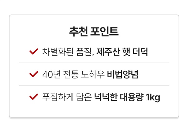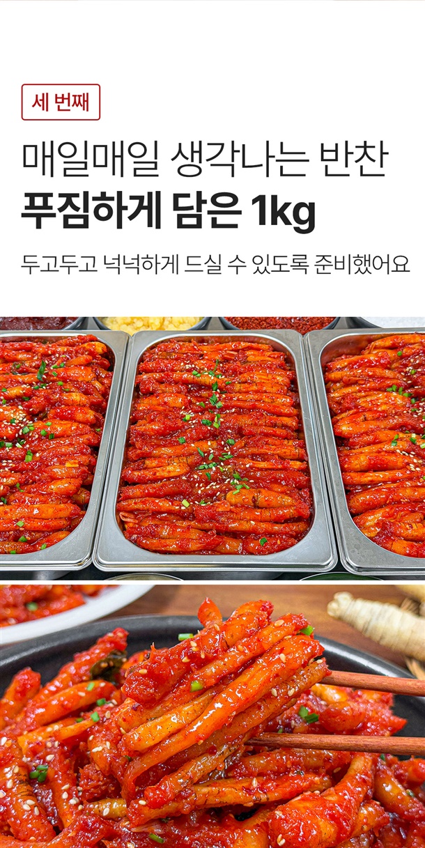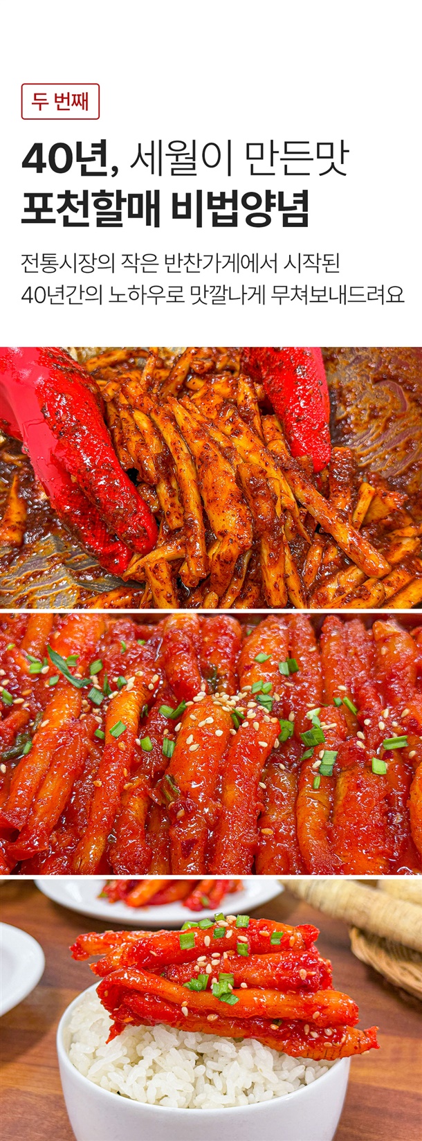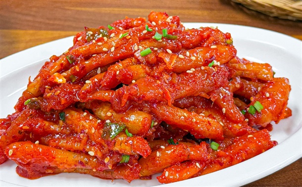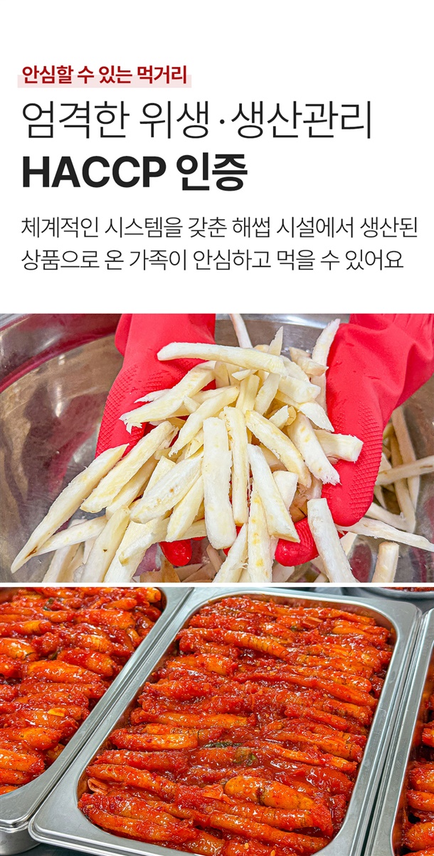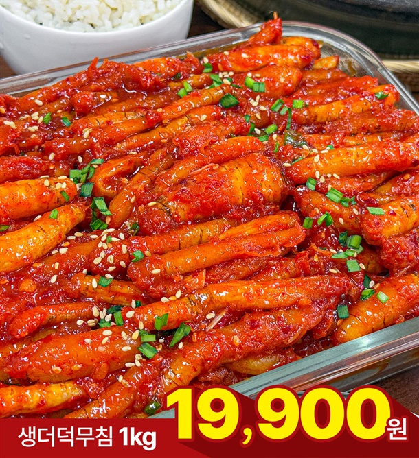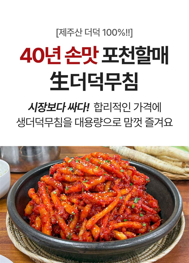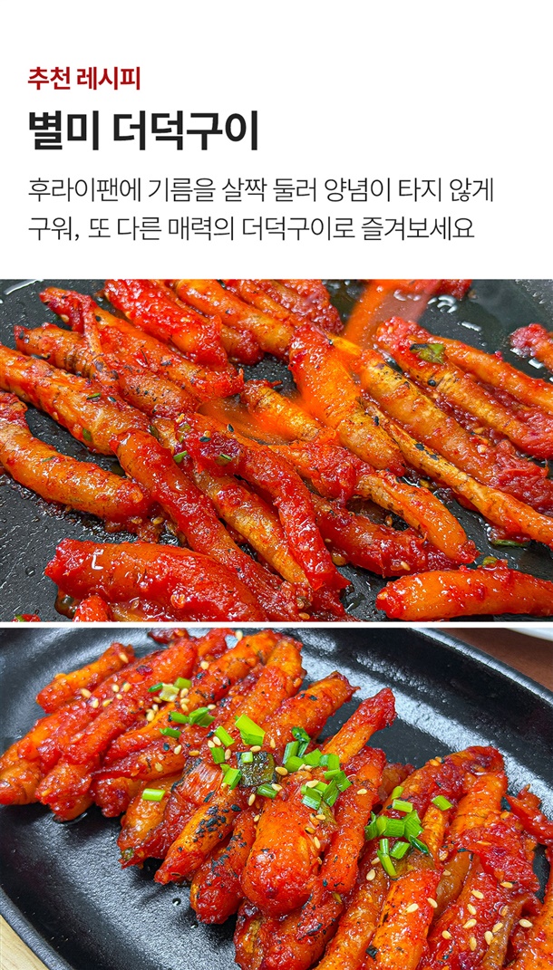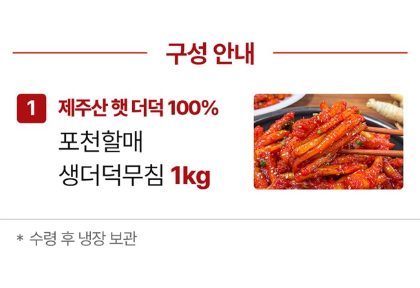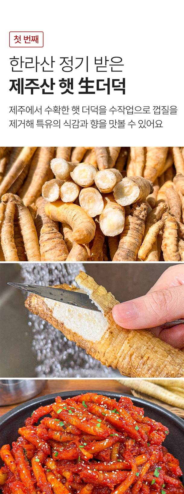 생더덕(국산)54.64%, 소스[물엿,고추장{밀가루(밀:미국산,호주산)},고춧가루(중국산),D-소비톨액,정제수,마늘], 설탕, 마늘(중국산), 고춧가루, 가공소금{재제소금[천일염(호주산)60%,정제염(중국산)38%,천일염(국산)2%]75%,정제염(중국산)25%}, 대파, 빙초산, L-글루탐산나트륨제제{L-글루탐산나트륨(향미증진제),5-이노신산Na,5-구아닐산Na}, 참깨 *밀 함유 |