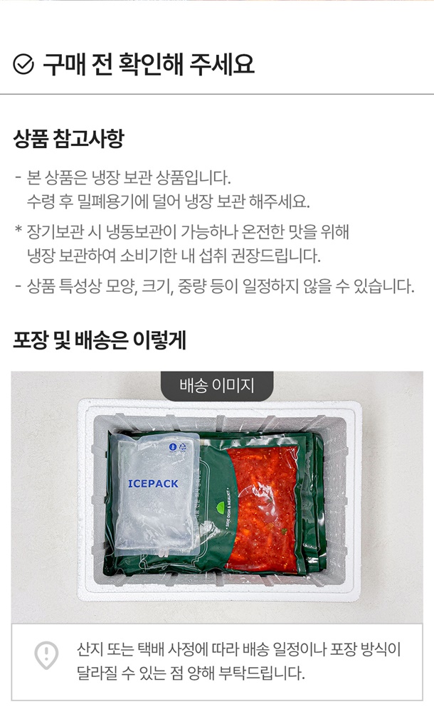 - 재판매가 불가한 신선식품 특성상 상품 하자 외의 단순변심(맛, 향, 식감 등)으로 인한 교환 및 반품이 불가합니다.