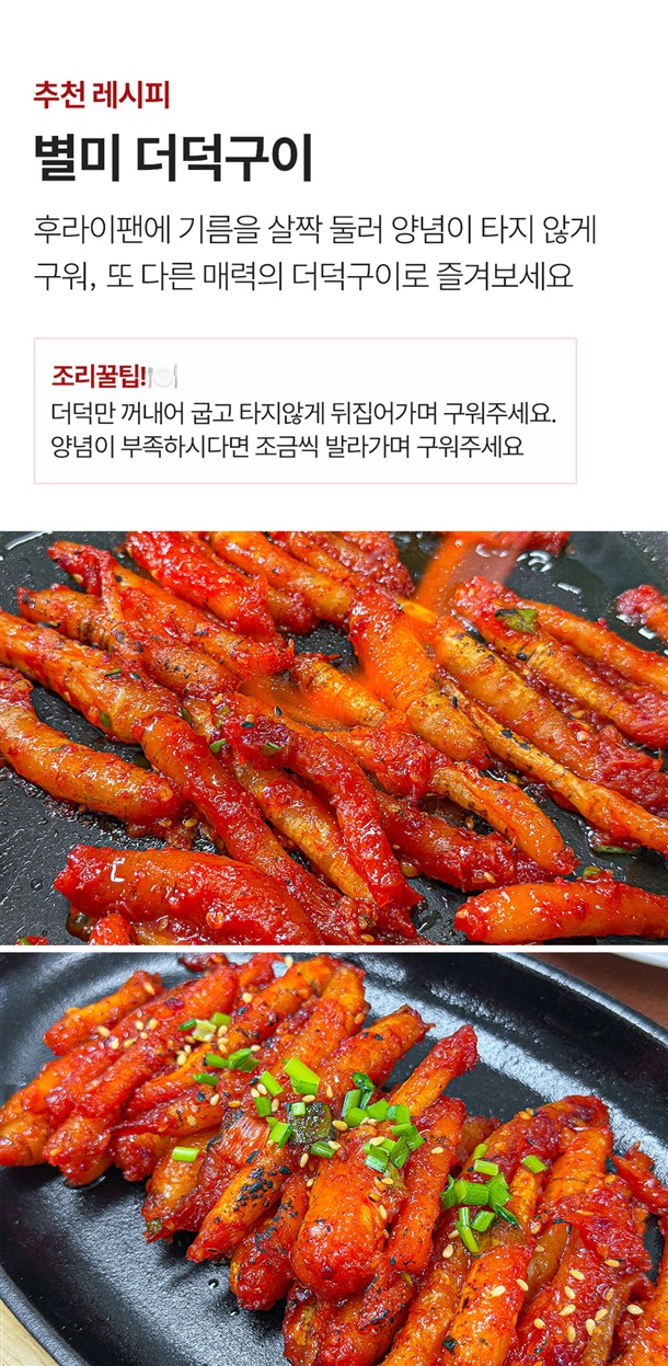 생더덕(국산)54.64%, 소스[물엿,고추장{밀가루(밀:미국산,호주산)},고춧가루(중국산),D-소비톨액,정제수,마늘], 설탕, 마늘(중국산), 고춧가루, 가공소금{재제소금[천일염(호주산)60%,정제염(중국산)38%,천일염(국산)2%]75%,정제염(중국산)25%}, 대파, 빙초산, L-글루탐산나트륨제제{L-글루탐산나트륨(향미증진제),5-이노신산Na,5-구아닐산Na}, 참깨 *밀 함유 |