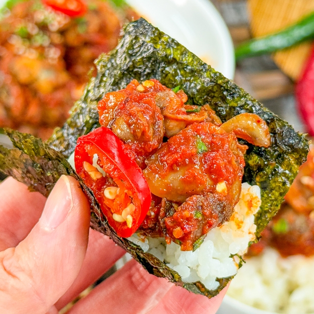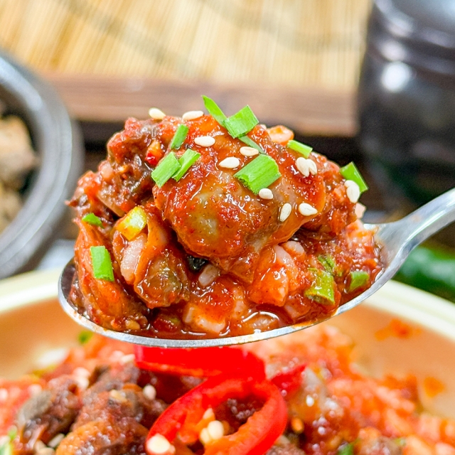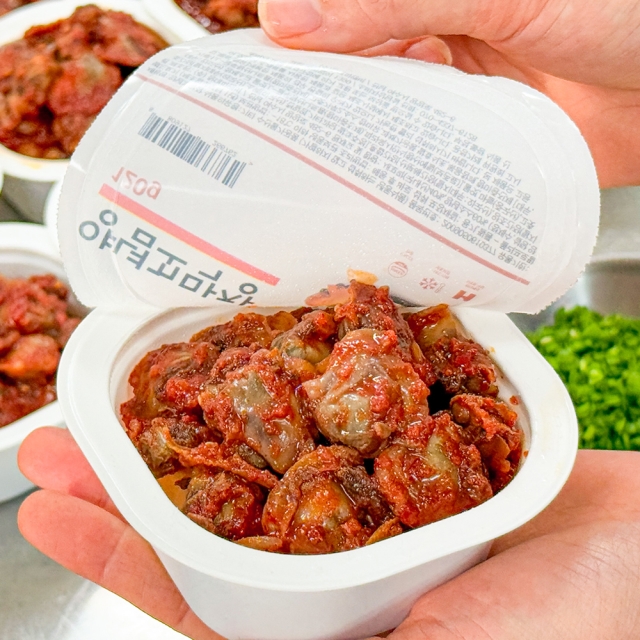 새꼬막(국내산)40%,양념소스60%(정제수,설탕,양조간장[탈지대두(외국산),소맥(미국산),천일염,기타과당,발효주정],혼합간장[산분해간장(탈지대두:외국산),양조간장(탈지대두:인도산),정제소금,물엿,L-글루탐산나트륨(향미증진제),파라옥시안식향산에틸(보조료)],물엿,마늘(중국산),고춧가루1,L-글루탐산나트륨(향미증진제),고춧가루2,소스,향미유,과채가공품,발효식초,볶음참깨,향미증진제[대두,밀,패류 함유] |