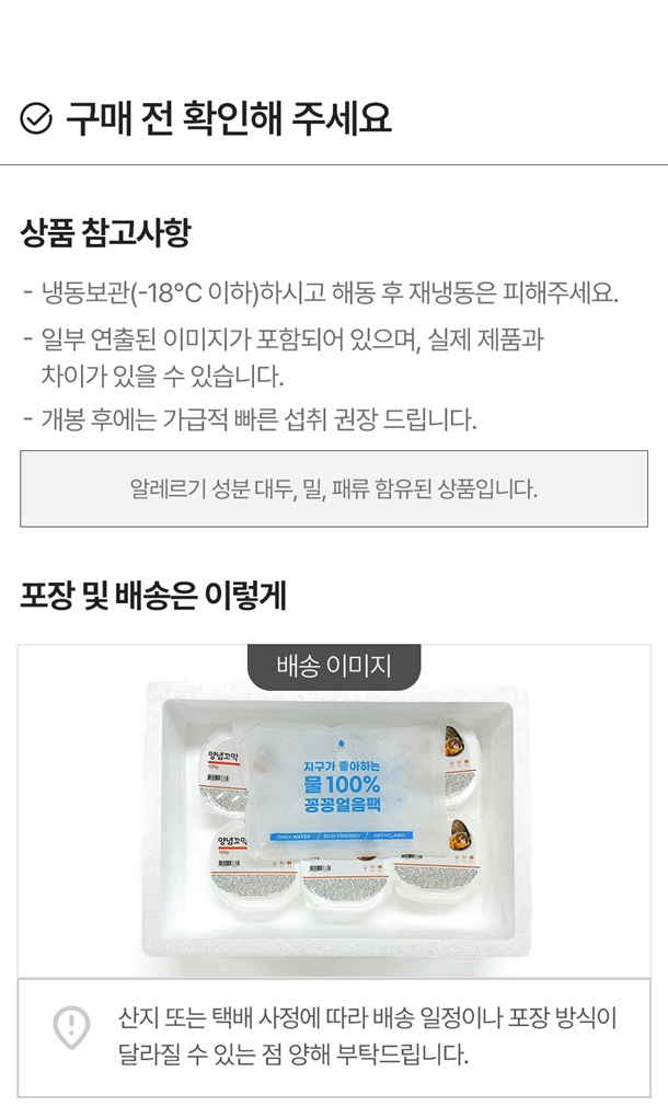 ㆍ개봉한 제품의 경우 변질의 우려가 있으니 가능한 빨리 섭취하시기 바랍니다. ㆍ본 제품은 고등어,오징어,조개류를 사용한 제품과 같은 제조시설에서 제조하고 있습니다. |