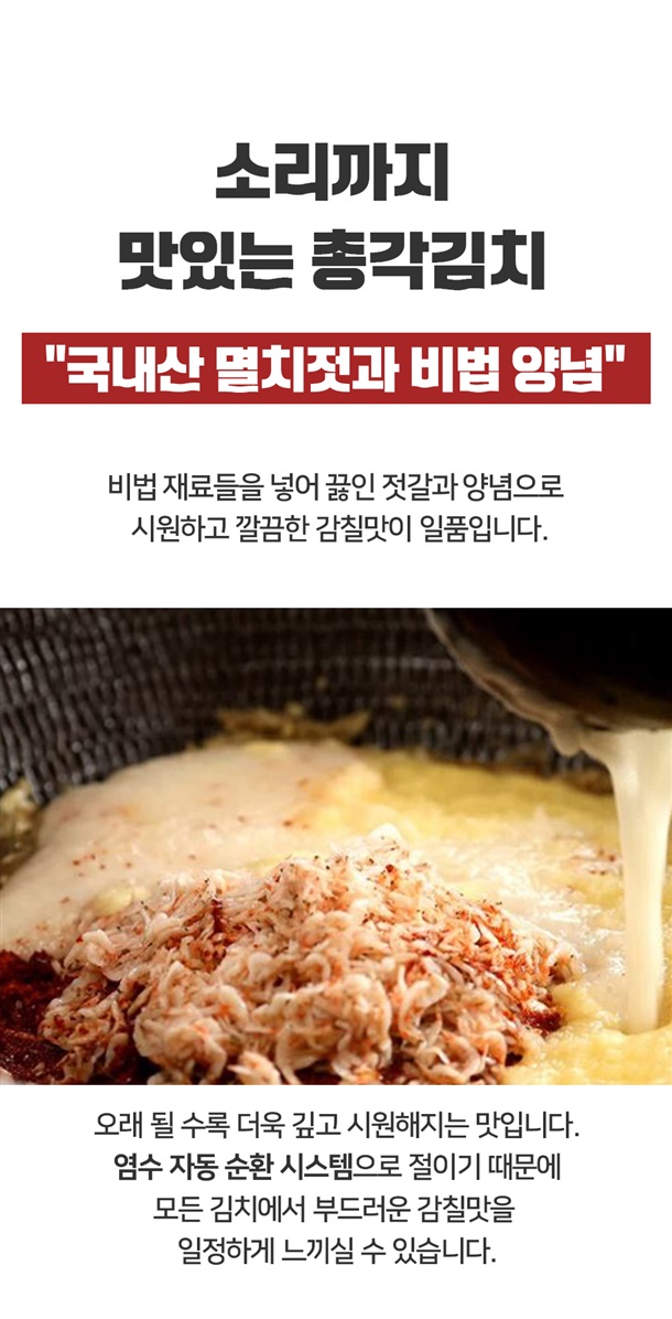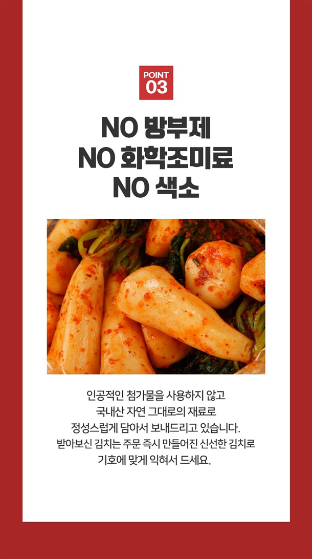 절임알타리무[(총각무(국내산)93%,천일염(국내산)1%,정제소금3%,정제수3%)]81.1%,절임열무[(열무(국내산)93%,천일염(국내산)1%,정제소금3%)]9.5%,김칫속7.2%(택배용양념)[고춧가루(국내산),찹쌀풀,멸치젓,멸치액[멸치액젓(국내산)],젓새우[새우젓(국내산)],마늘,양파,생강,물엿,설탕,정제수],설탕0.4%,파0.7%,새우젓0.51%,고춧가루0.27%,마늘0.32% [새우함유] |