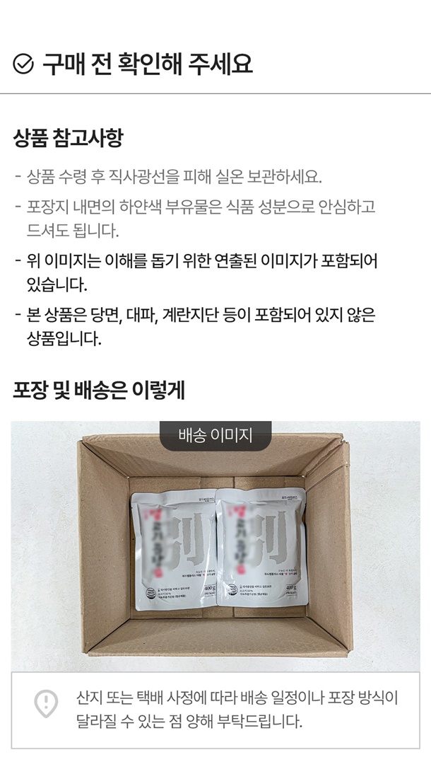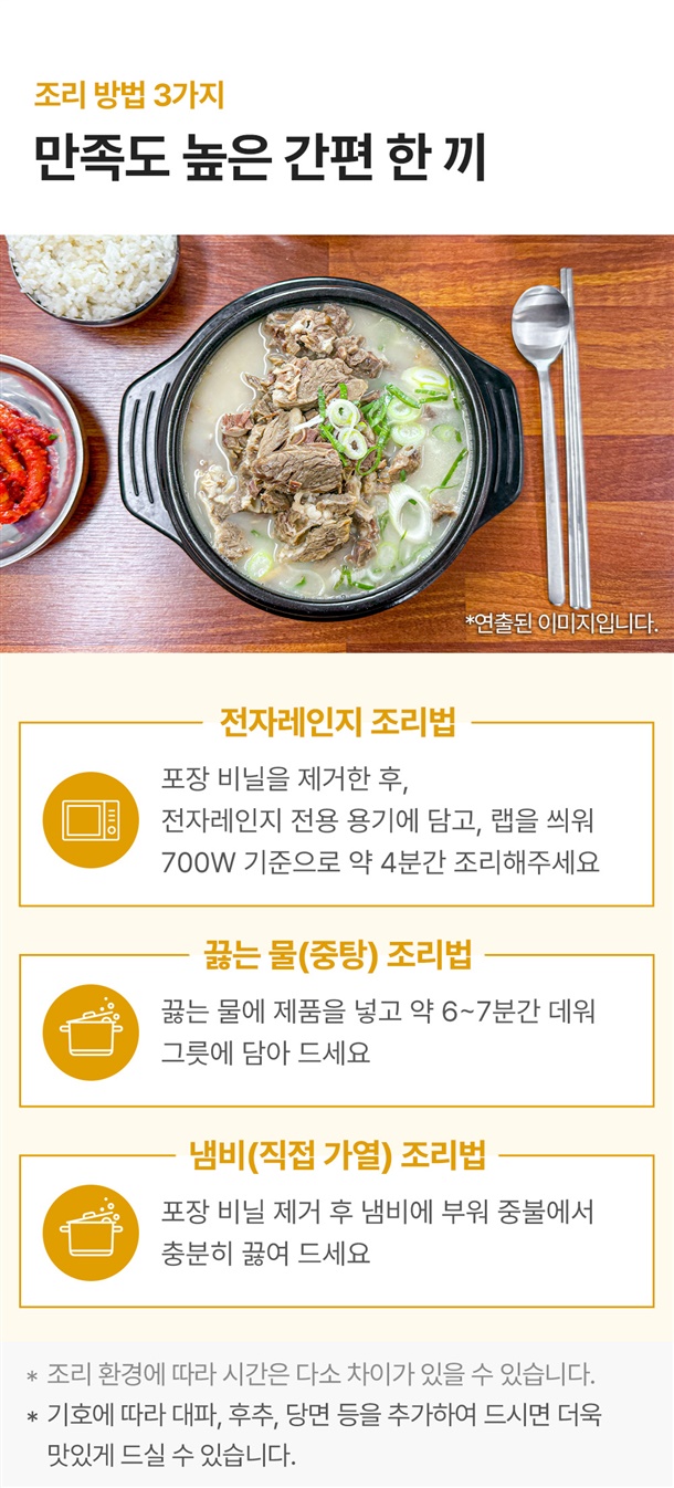 ㆍ조리시 자리를 뜨지 마시고 조리과정을 확인하십시오. ㆍ끓는 물에 중탕 조리시 뜨거운 물이 튈 수 있으니 주의하십시오. ㆍ끓는 물에 중탕 시 봉지가 터질 우려가 있으니 냄비뚜껑을 덮지 마십시오. ㆍ제품 개봉시 손을 다칠 위험이 있으니 주의하십시오. ㆍ개봉한 제품은 변질 될 우려가 있으니, 반드시 냉장보관 하시고 가급적 빨리 드십시오. ㆍ포장지 내면의 하얀색 부유물은 식품 성분으로 안심하고 드셔도 됩니다. ㆍ본 제품은 알류, 우유, 메밀, 땅콩, 고등어, 게, 새우, 돼지고기, 복숭아, 토마토, 아황산류, 호두, 닭고기, 오징어, 조개류(굴,전복,홍합 포함), 잣을 사용한 제품과 같은 제조시설에서 제조하고 있습니다. ㆍ유통과정에서 부풀어 오른 제품이나 변질된 제품은 판매원 및 구입처에서 교환하여 드립니다. (취급 중 포장이 파손되면 제품 변질의 우려가 있습니다.)