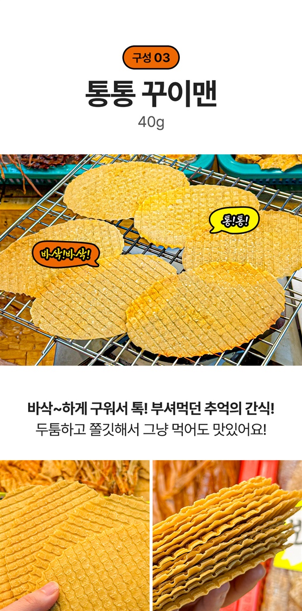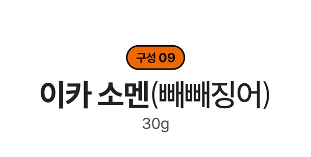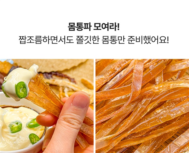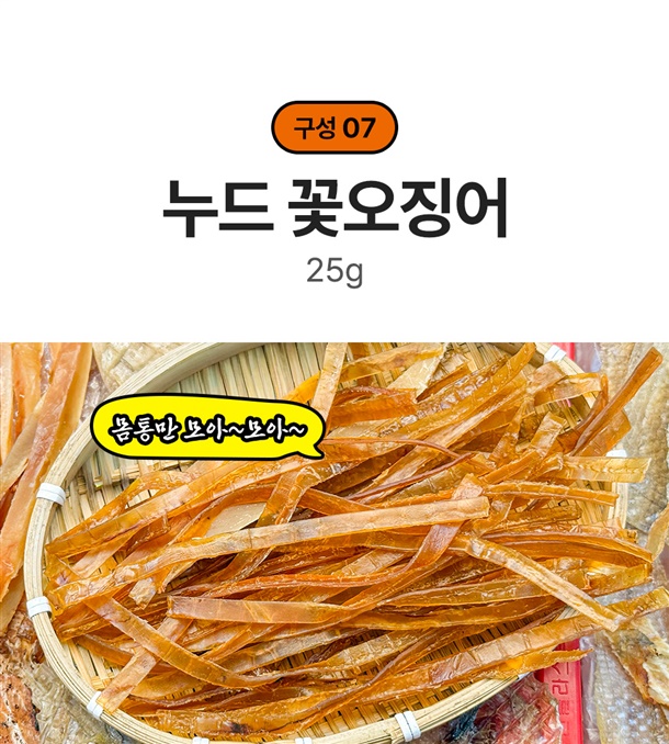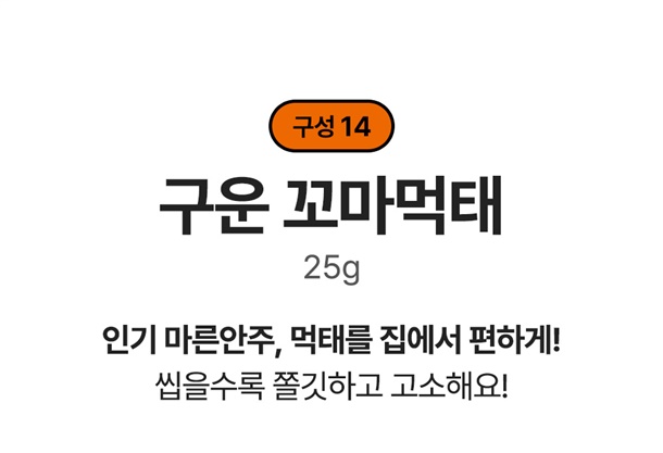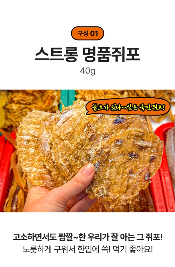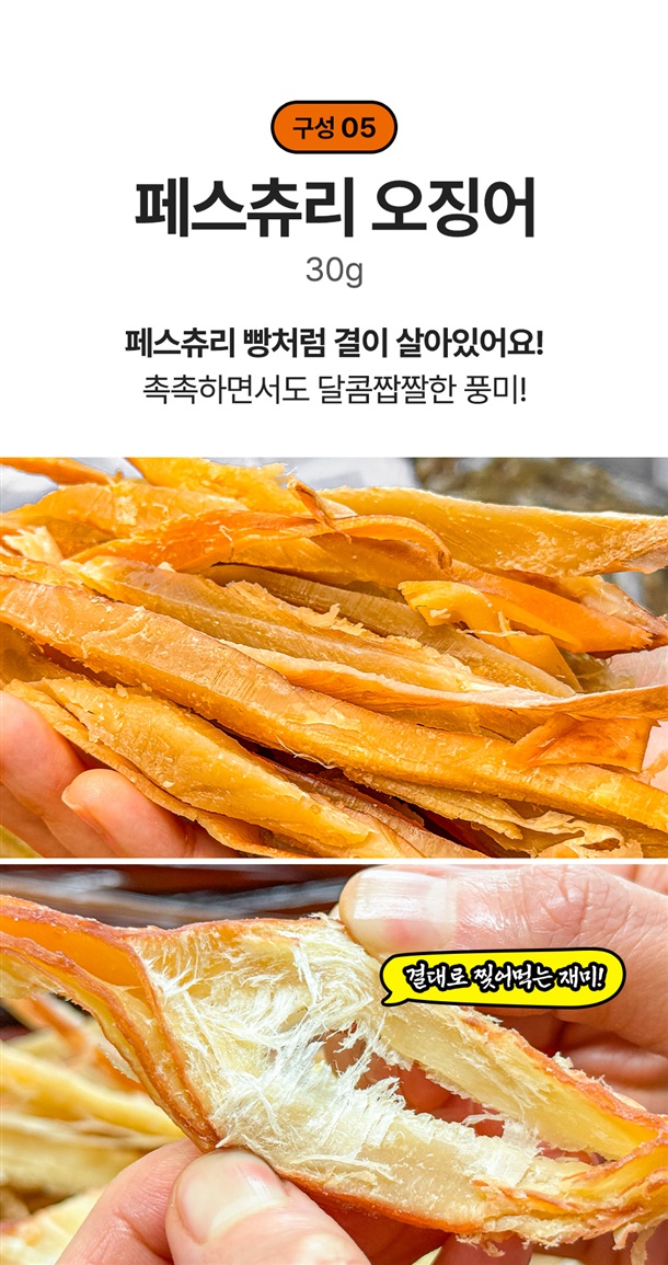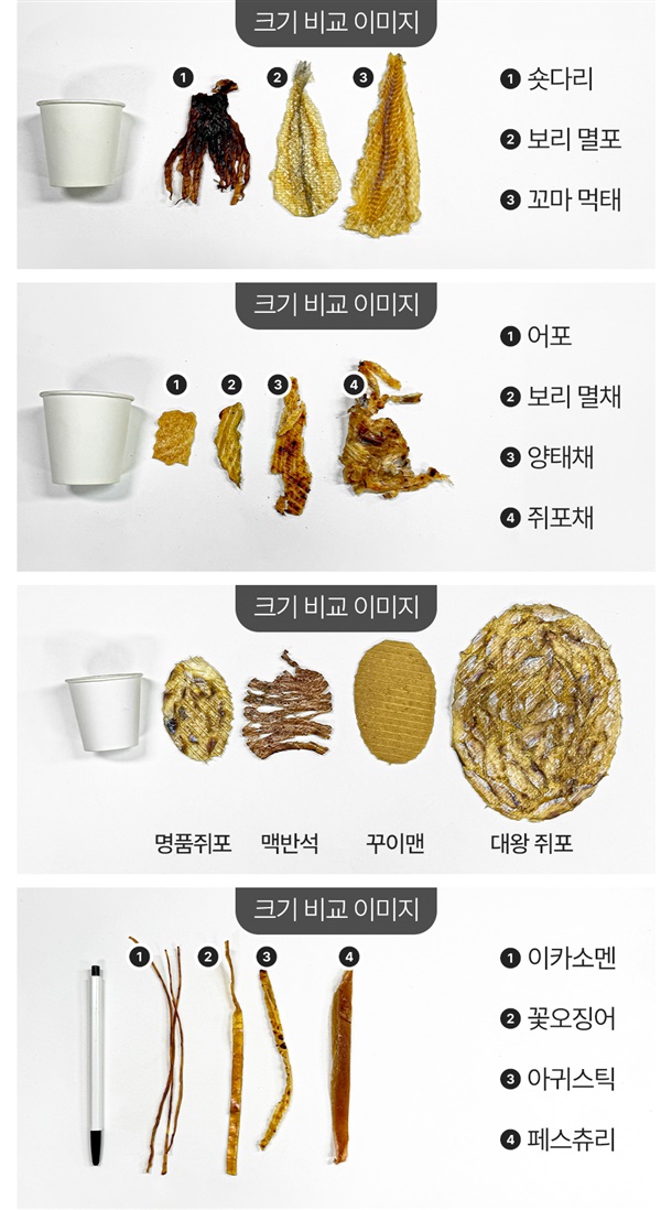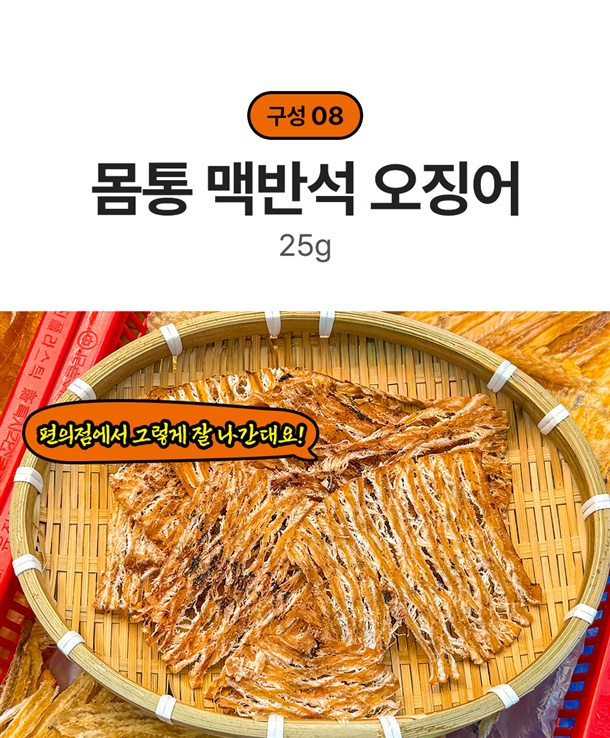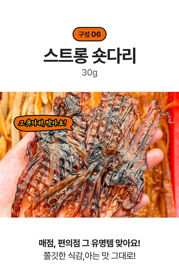 스트롱명품쥐포, 얼굴만한 대왕쥐포, 구운쥐포채: 쥐치포89%, 설탕7%, D-소비톨2%, 정제소금1%, L-글루탐산나트륨(향미증진제)1% / 통통꾸이맨: 연육(베트남산/어육,설탕,산도조절제)87.0%, 백설탕, 밀가루, 타피오카전분(태국산), 정제소금(태국산), L-글루탐산나트륨(향미증진제). 합성팽창제(산성피로인산나트륨,탄산수소나트륨,옥수수전분,제일인산칼슘,젖산칼슘), 탄산칼슘(밀 함유) / 빠삭이어포: 기타어육가공품90%[연육(베트남산/어육,설탕,산도조절제)87%, 백설탕, 밀가루, 타피오카전분(태국산), 정제소금(태국산), L-글루타민산나트륨(향미증진제), 합성팽창제(산성피로인산나트륨,탄산수소나트륨,옥수수전분,제일인산칼슘,젖산칼슘),탄산칼슘], 콩기름(대두유)10% / 페스츄리 바베큐 오징어: 오징어80.6%, 설탕, D-소비톨(감미료), 정제소금(국산), L-글루탐산나트륨(향미증진제), 콩기름(대두유), DL-사과산, 소브산칼륨(보존료) / 숏다리, 누드 꽃 오징어, 이카소멘: 오징어90.9%, 설탕5%, D-소비톨, 정제소금(국내산), L-글루탐산나트륨(향미증진제), 호박산이나트륨, 포도당, 글리신구연산, 소브산칼륨(보존료) / 맥반석구이 오징어: 오징어82.48%, 설탕4.52%, D-소비톨4.75%, 정제소금(국내산)4%, L-글루탐산나트륨(향미증진제)0.4%, 호박산이나트륨0.3%, 핵산0.1%, 구연산0.3%, 글리신0.2%, 스테비올배당체0.02% / 보리멸포, 구운보리멸채: 보리멸포(베트남)89%, 설탕7%, D-소비톨2%, 정제소금1%, L-글루탐산나트륨(향미증진제)1% / 구운양태채: 조미양태포89%, 설탕7%, D-소비톨2%, 정제소금1%, L-글루탐산나트륨(향미증진제)1% / 꼬마먹태: 조미명태포100%[양태어육(러시아산)92%,설탕,D-소비톨,정제소금(국내산),L-글루탐산나트륨(향미증진제)] / 구운 아귀스틱: 아귀86.9%, 설탕9%, D-소비톨3%, 정제소금1%, L-글루탐산나트륨(향미증진제)0.1% / 꿀땅콩: 땅콩48.5%, 밀가루, 설탕, 벌꿀3%, 옥수수유, 덱스트린, 소금 *땅콩, 밀 함유 |