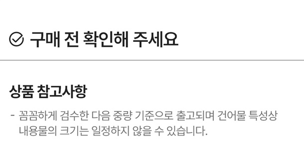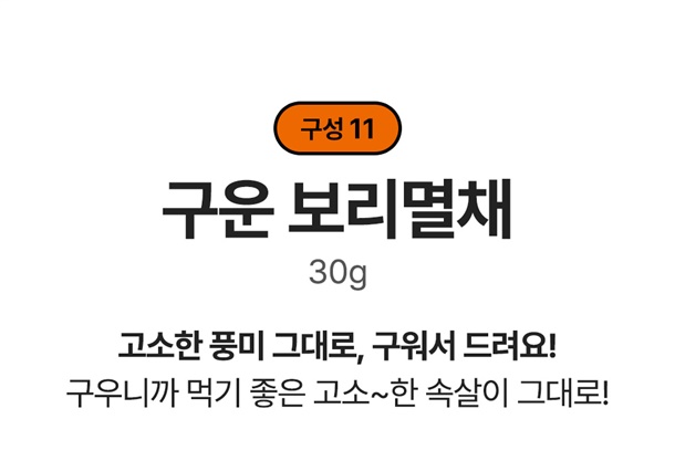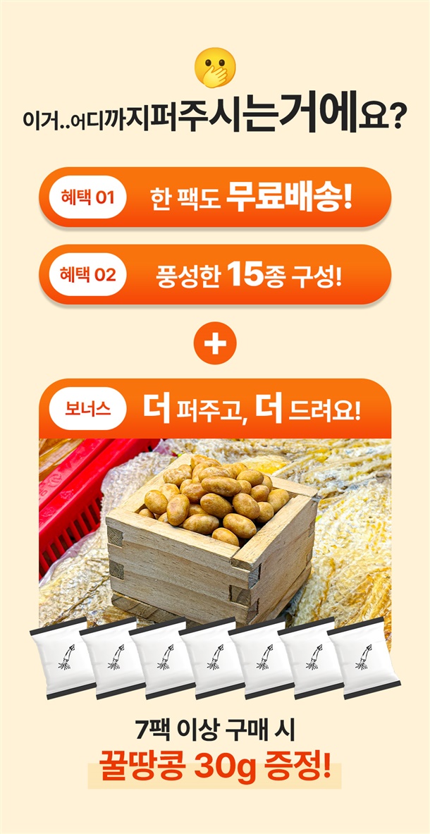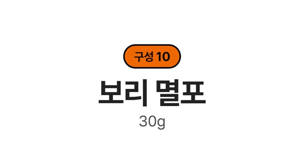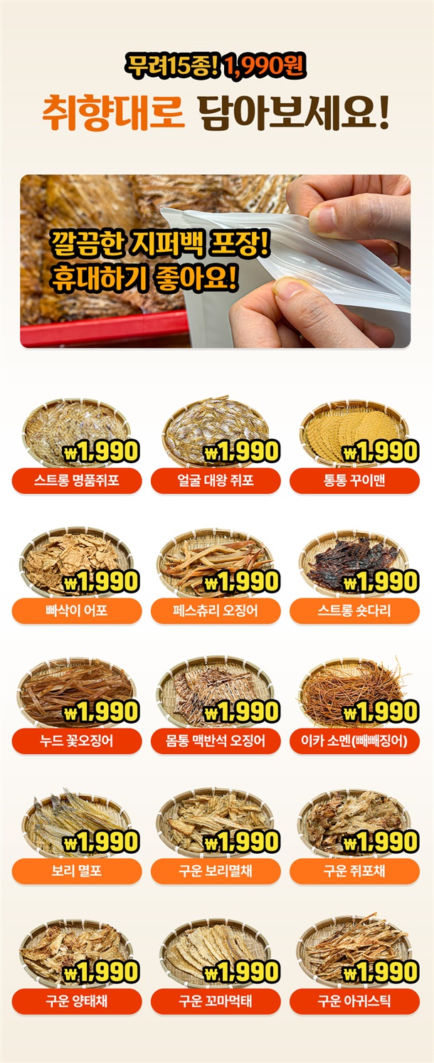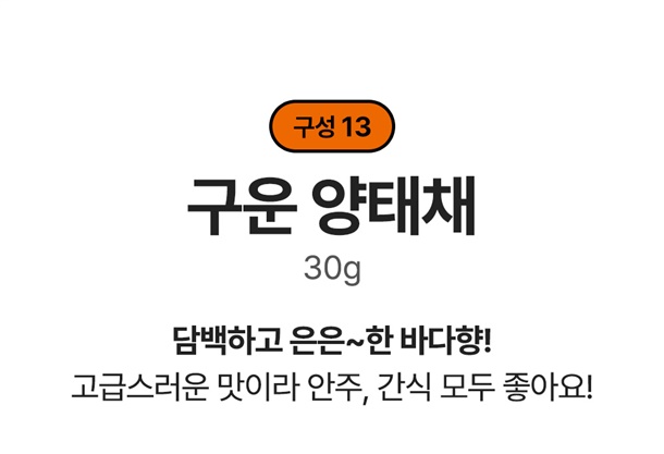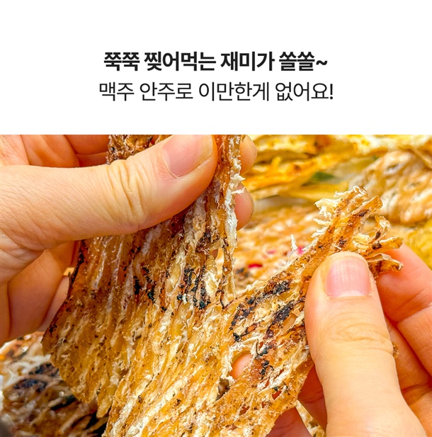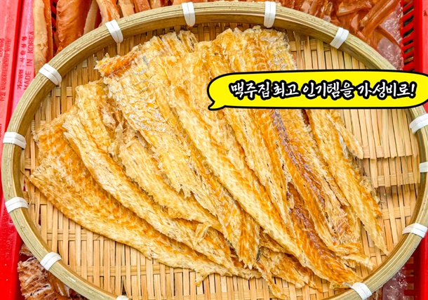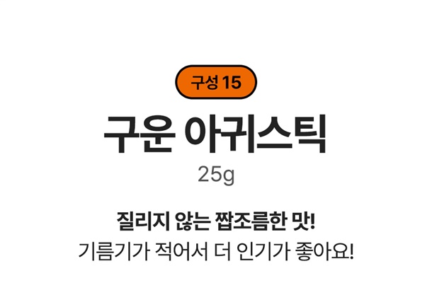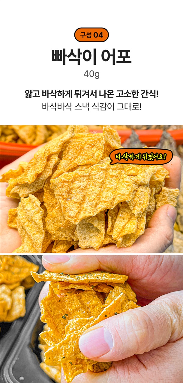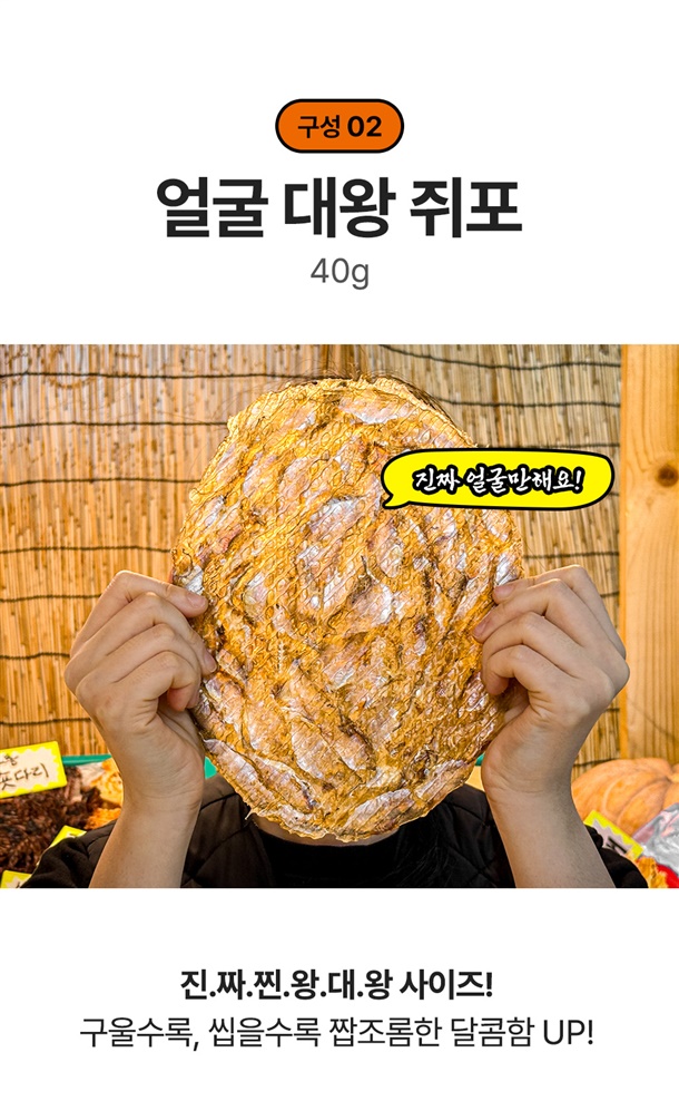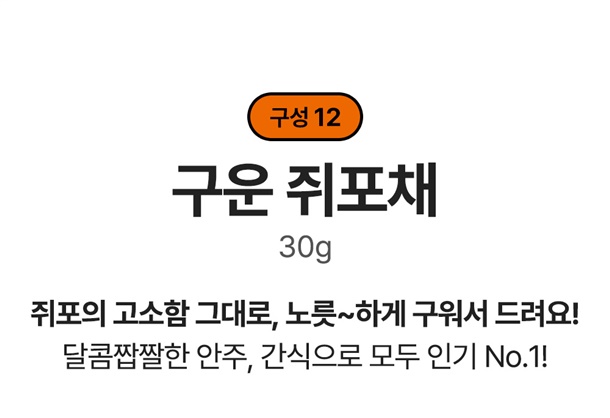 스트롱명품쥐포, 얼굴만한 대왕쥐포, 구운쥐포채: 쥐치포89%, 설탕7%, D-소비톨2%, 정제소금1%, L-글루탐산나트륨(향미증진제)1% / 통통꾸이맨: 연육(베트남산/어육,설탕,산도조절제)87.0%, 백설탕, 밀가루, 타피오카전분(태국산), 정제소금(태국산), L-글루탐산나트륨(향미증진제). 합성팽창제(산성피로인산나트륨,탄산수소나트륨,옥수수전분,제일인산칼슘,젖산칼슘), 탄산칼슘(밀 함유) / 빠삭이어포: 기타어육가공품90%[연육(베트남산/어육,설탕,산도조절제)87%, 백설탕, 밀가루, 타피오카전분(태국산), 정제소금(태국산), L-글루타민산나트륨(향미증진제), 합성팽창제(산성피로인산나트륨,탄산수소나트륨,옥수수전분,제일인산칼슘,젖산칼슘),탄산칼슘], 콩기름(대두유)10% / 페스츄리 바베큐 오징어: 오징어80.6%, 설탕, D-소비톨(감미료), 정제소금(국산), L-글루탐산나트륨(향미증진제), 콩기름(대두유), DL-사과산, 소브산칼륨(보존료) / 숏다리, 누드 꽃 오징어, 이카소멘: 오징어90.9%, 설탕5%, D-소비톨, 정제소금(국내산), L-글루탐산나트륨(향미증진제), 호박산이나트륨, 포도당, 글리신구연산, 소브산칼륨(보존료) / 맥반석구이 오징어: 오징어82.48%, 설탕4.52%, D-소비톨4.75%, 정제소금(국내산)4%, L-글루탐산나트륨(향미증진제)0.4%, 호박산이나트륨0.3%, 핵산0.1%, 구연산0.3%, 글리신0.2%, 스테비올배당체0.02% / 보리멸포, 구운보리멸채: 보리멸포(베트남)89%, 설탕7%, D-소비톨2%, 정제소금1%, L-글루탐산나트륨(향미증진제)1% / 구운양태채: 조미양태포89%, 설탕7%, D-소비톨2%, 정제소금1%, L-글루탐산나트륨(향미증진제)1% / 꼬마먹태: 조미명태포100%[양태어육(러시아산)92%,설탕,D-소비톨,정제소금(국내산),L-글루탐산나트륨(향미증진제)] / 구운 아귀스틱: 아귀86.9%, 설탕9%, D-소비톨3%, 정제소금1%, L-글루탐산나트륨(향미증진제)0.1% / 꿀땅콩: 땅콩48.5%, 밀가루, 설탕, 벌꿀3%, 옥수수유, 덱스트린, 소금 *땅콩, 밀 함유 |