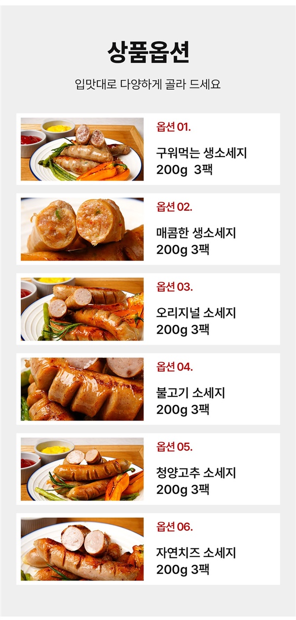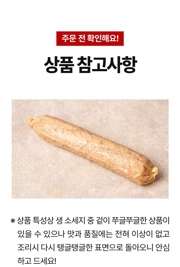 | 품목보고번호 | 구워먹는 생소시지-2011047600830 / 매콤한 생소시지-2011047600838 / 오리지널소시지-2011047600833 / 불고기소시지-2011047600834 / 청양고추소시지-2011047600835 / 자연치즈소시지-2011047600817 |