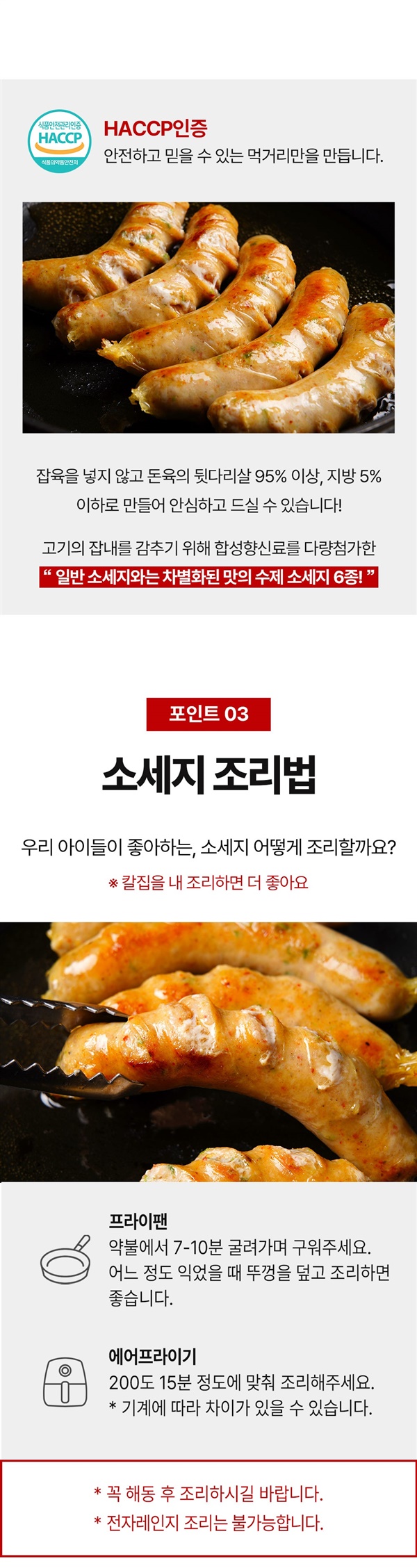 | 소비자안전을 위한 주의사항 | 이 제품은 돼지고기,우유,소고기,대두,밀,계란을 사용한 제품과 같은 제조시설에서 제조합니다. 자연치즈소시지-이 제품은 가공치즈가 아닌 모짜렐라 자연치즈로 생산되었습니다. |