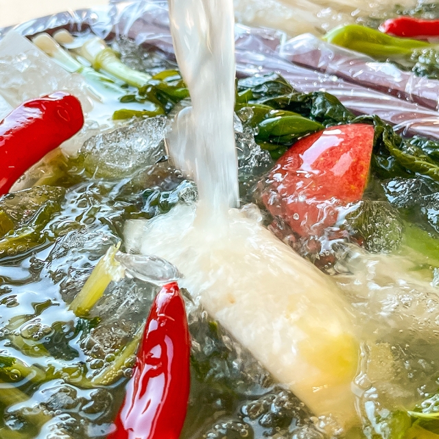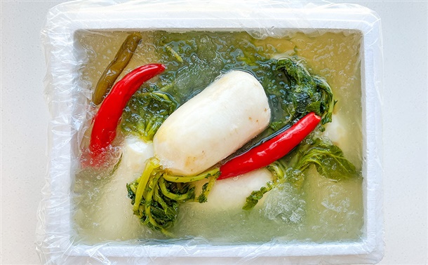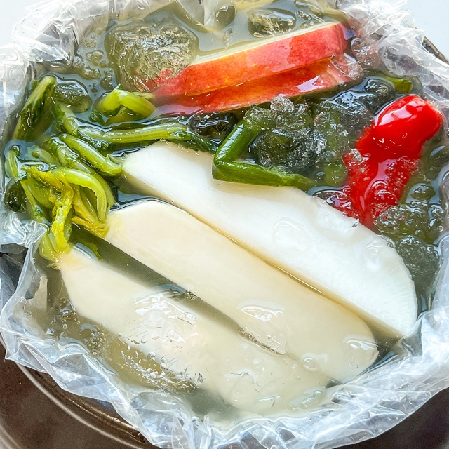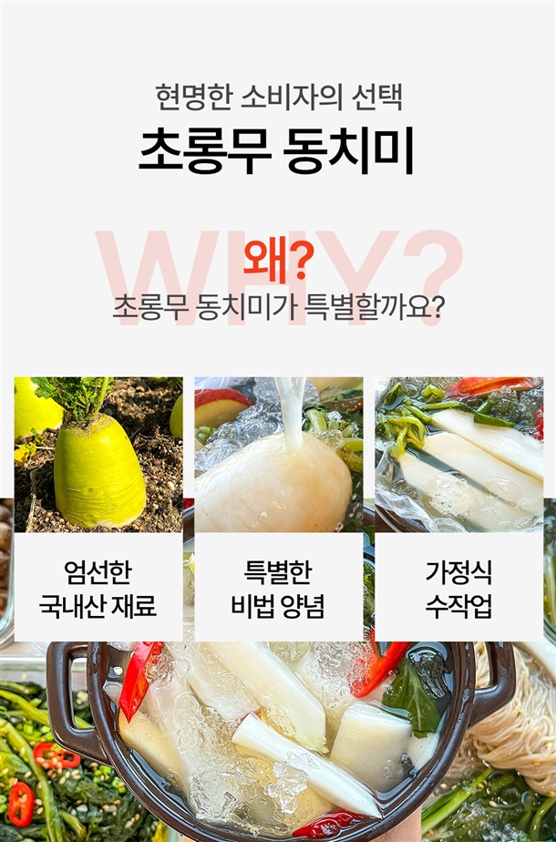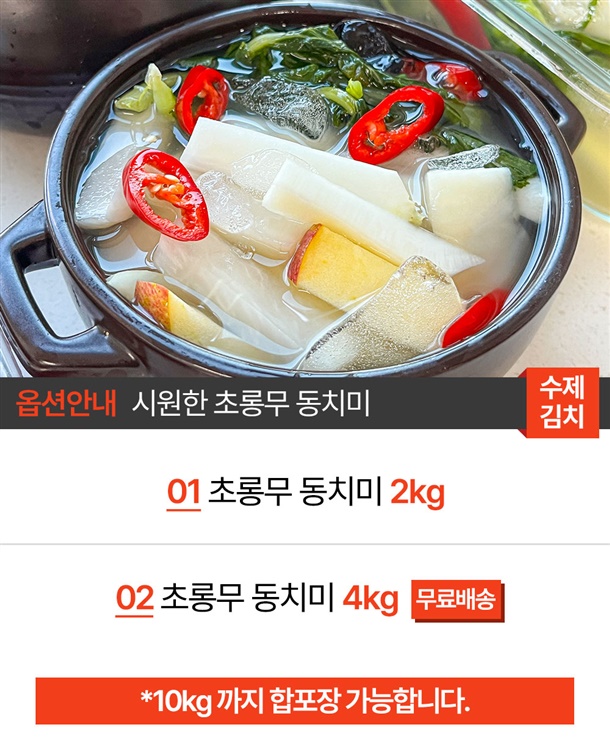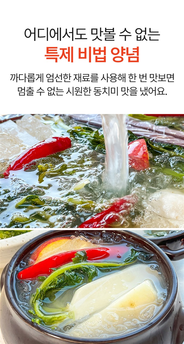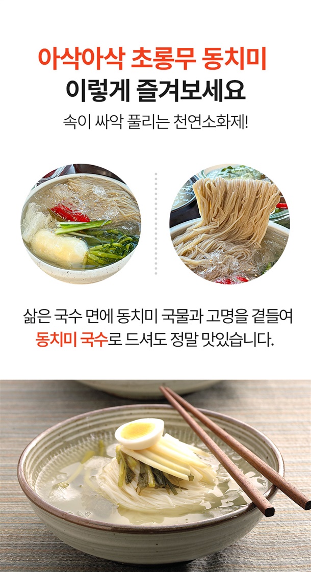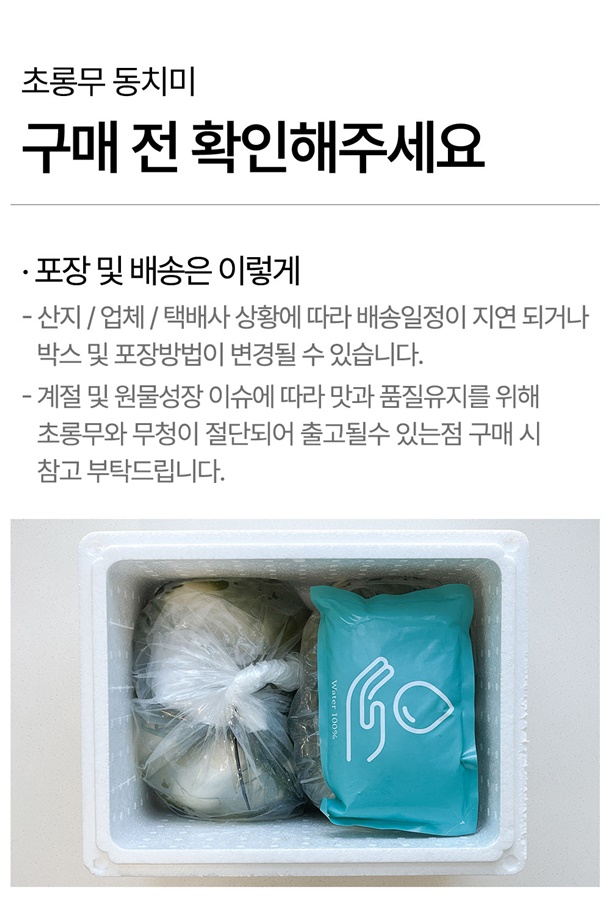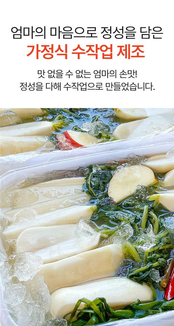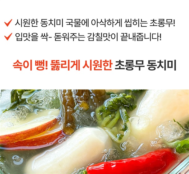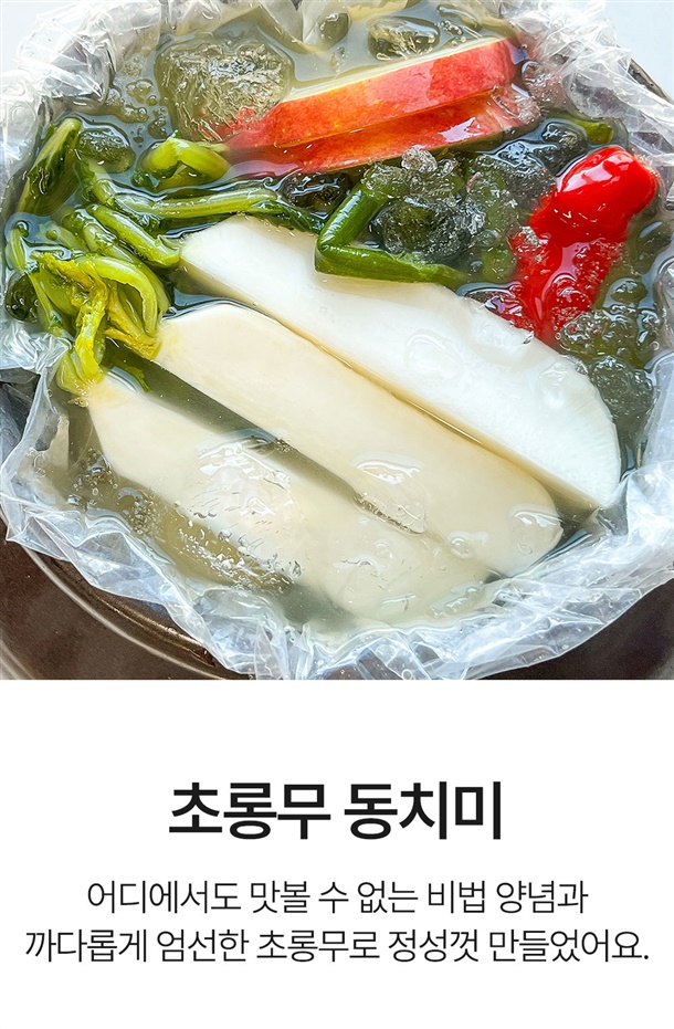 무(국내산)40%, 정제수(국내산)30%, 삭힌고추(국내산)3%, 갓(국내산)3%, 쪽파(국내산)3%, 마늘(국내산)2%, 생강(국내산)1%, 사과(국내산)2%, 배(국내산)2%, 양파(국내산)3%, 염장새우(국내산)3%, 천일염(국내산)5%, 찹쌀풀(국내산)3% |