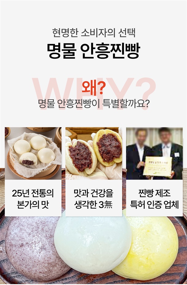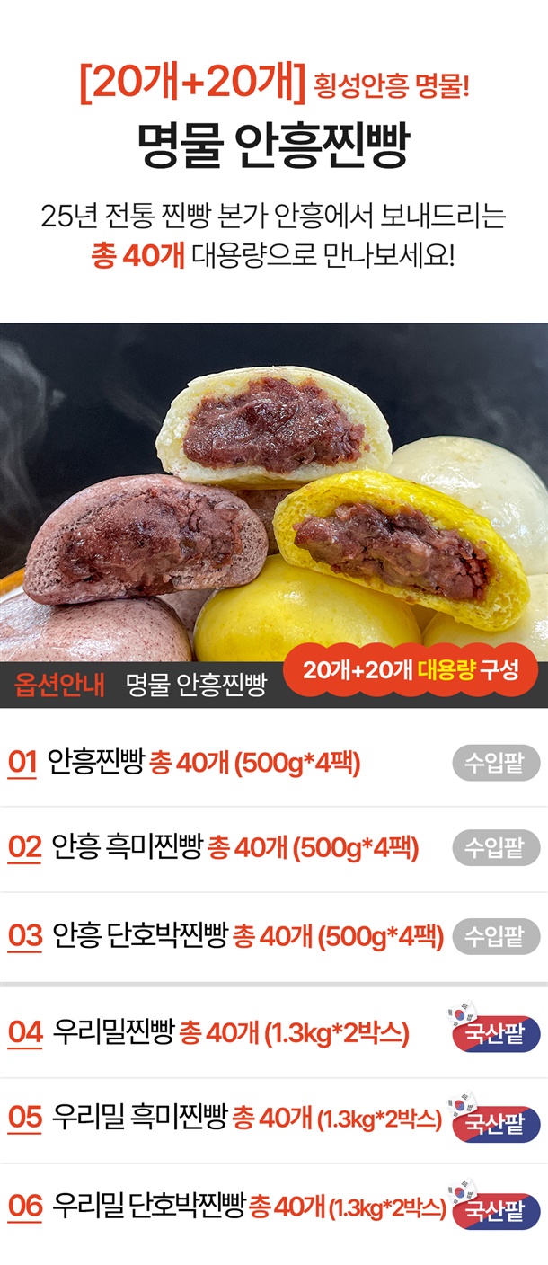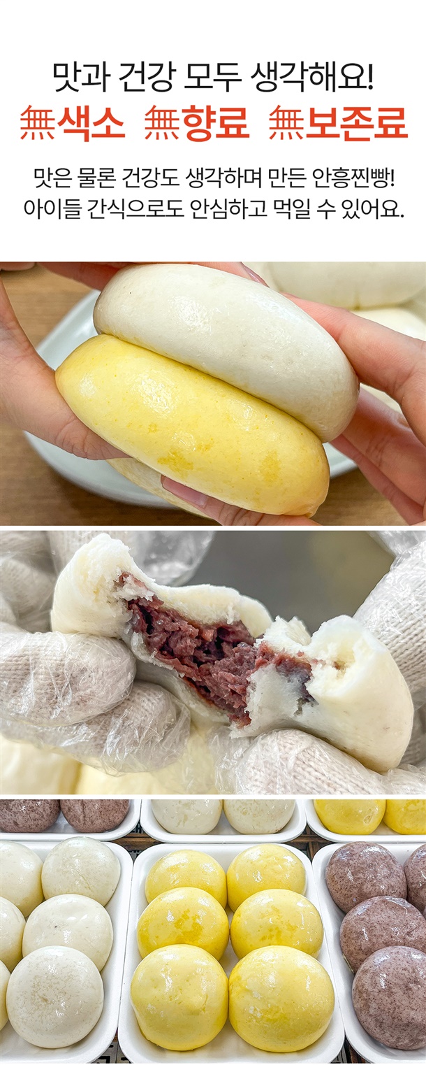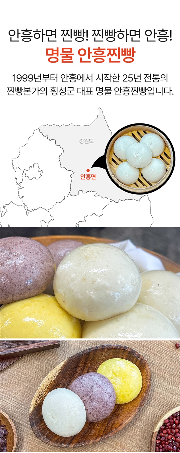 | 품명 | 본가안흥찐빵 / 안흥 흑미 찐빵 / 안흥 단호박 찐빵 / 우리밀 찐빵 / 우리밀 흑미 찐빵 / 우리밀 단호박 찐빵 |