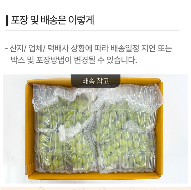- 배송일 지정은 불가하며 산지에서 순차적으로 출고됩니다. 배송 메시지는 배송 시 택배기사에게 전달되는 사항으로 날짜가 기재 되어있어도 지정일 배송이 어렵습니다.