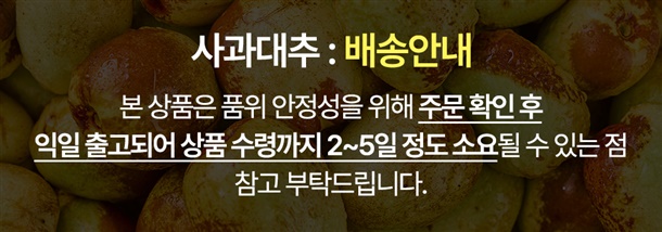 - 배송일 지정은 불가하며 산지에서 순차적으로 출고됩니다. 배송 메시지는 배송 시 택배기사에게 전달되는 사항으로 날짜가 기재 되어있어도 지정일 배송이 어렵습니다.