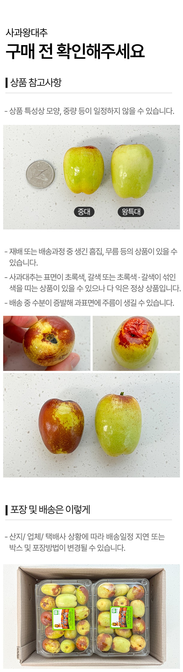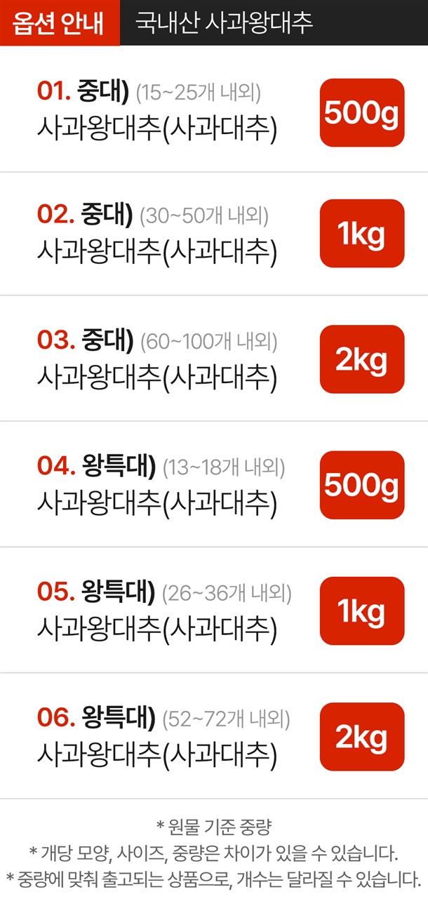 중대 500g(15~25개 내외), 1kg(30~50개 내외), 2kg(60~100개 내외) / 왕특대 500g(13~18개 내외), 1kg(26~36개 내외), 2kg(52~72개 내외) |