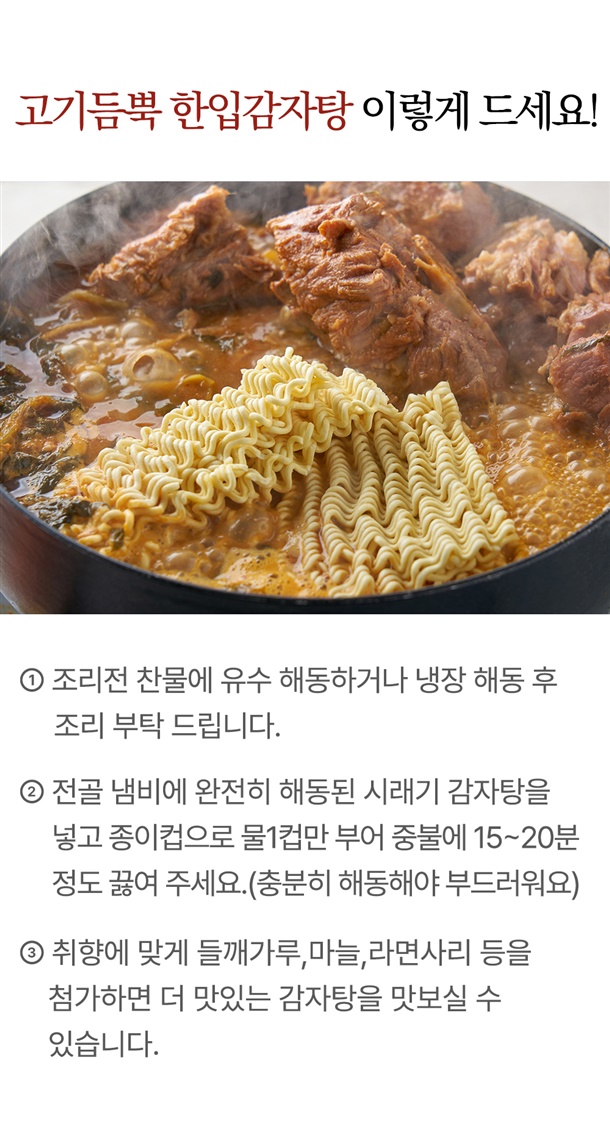 이 제품은 알레르기 발생가능성이 있는 알류, 메밀, 땅콩, 고등어, 게, 새우, 닭고기, 복숭아, 토마토, 아황산류, 호두, 오징어, 조개류(굴, 전복, 홍합포함), 잣을 사용한 제품과 같은 제조시설에서 제조 하고 있습니다. ?이미 냉동된 바 있으니 해동후 재냉동 시키지 마시길 바랍니다. ?뼈가 있는 제품이므로 섭취 시 다치지 않도록 주의해주세요. ?조리 중이나 용기로 옮길 때 화상위험이 있으니 주의하십시오. ?심한 충격은 피하고 개봉한 제품은 변질 우려가 있으니 바로 드십시오.