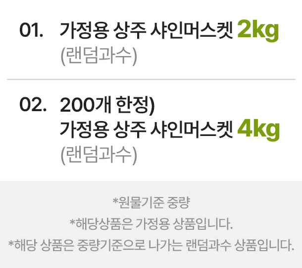 - 배송일 지정은 불가하며 산지에서 순차적으로 출고됩니다. 배송 메시지는 배송 시 택배기사에게 전달되는 사항으로 날짜가 기재 되어있어도 지정일 배송이 어렵습니다.