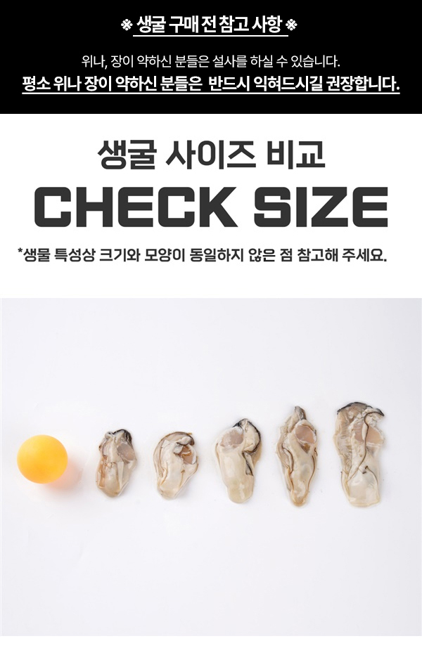 해당 상품은 생굴 상품으로 위나 장이 약하신 분들은 구매시 유의 부탁드리며 평소 위나 장이 약하신 분들은 반드시 익혀 드실 권장 합니다 |