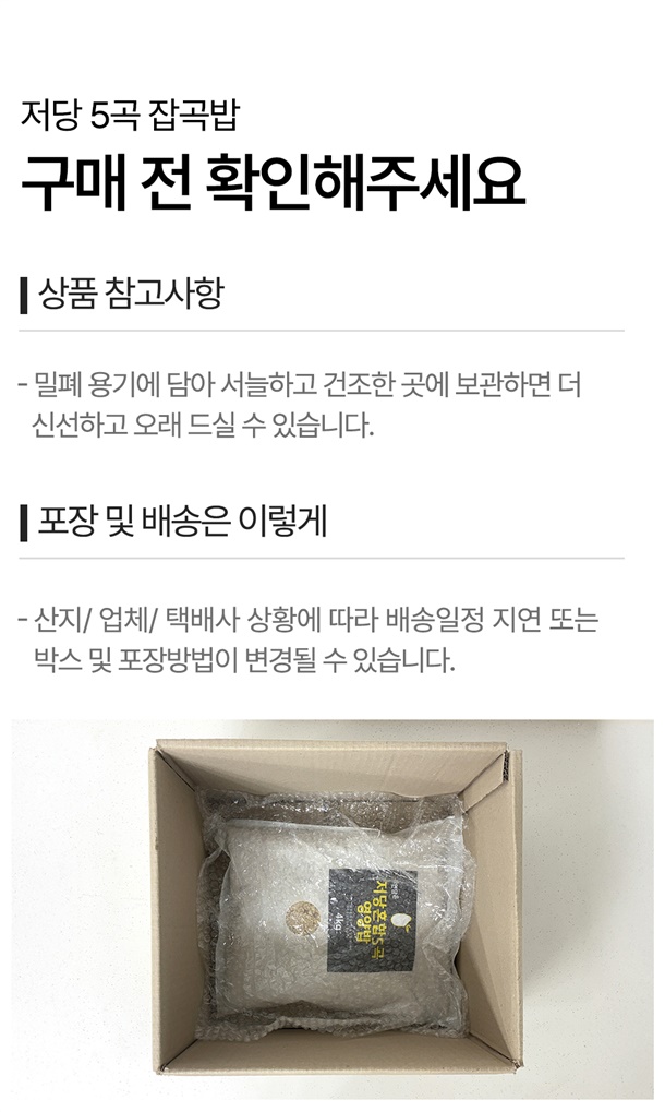 ㆍ쌀은 보관방법에 따라 맛 변화와 품질 저하(곰팡이, 이취, 벌레, 변질 발생) 가능성이 있으므로 보관방법을 참고하여 보관하시기 바랍니다. ㆍ구매하신 쌀은 개봉 후 쌀독, 항아리 등 밀폐된 보관용기에 담아 보관하시기 바랍니다. ㆍ좋은 밥맛을 위해 개봉 후 일정기간 내(하절기 15일, 그외 기간 30일) 드시는 것이 좋습니다.