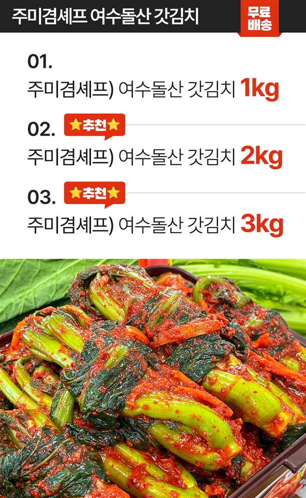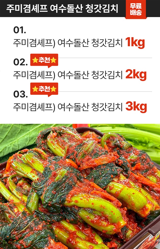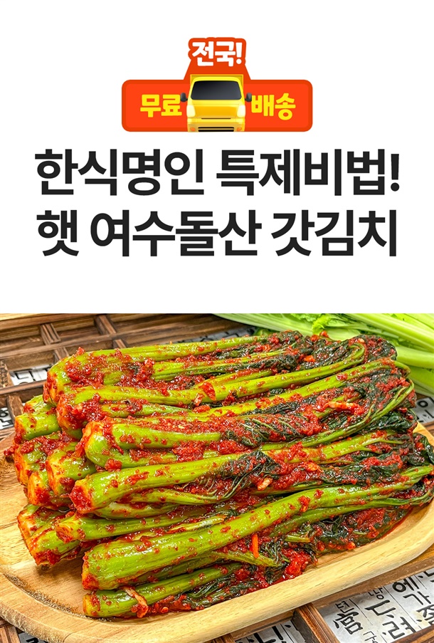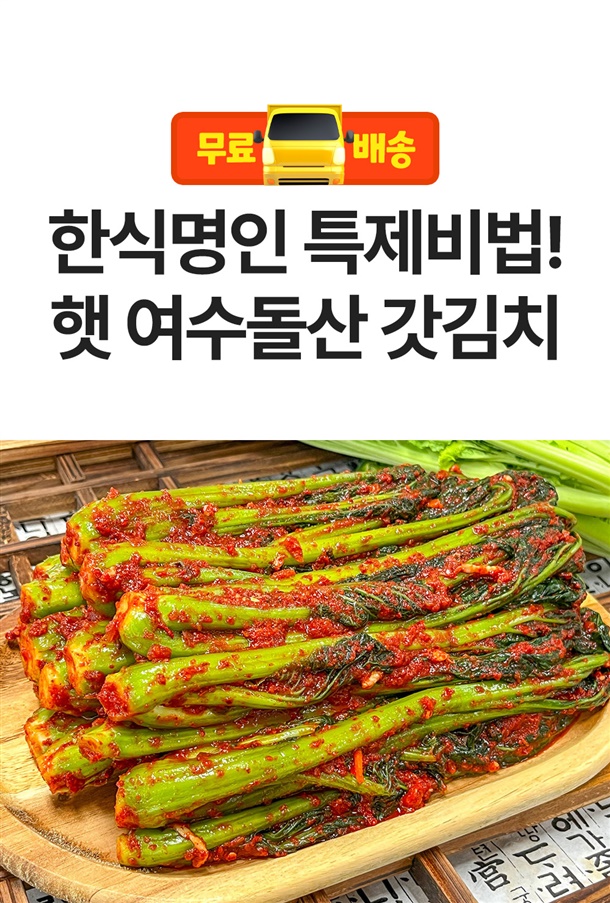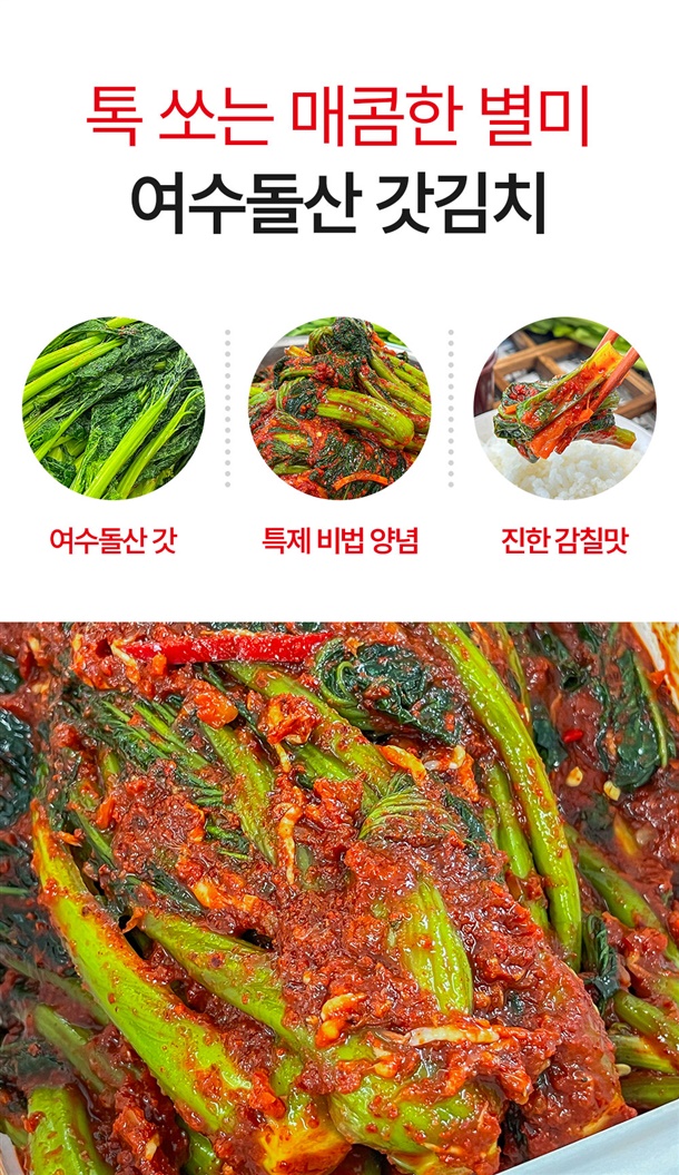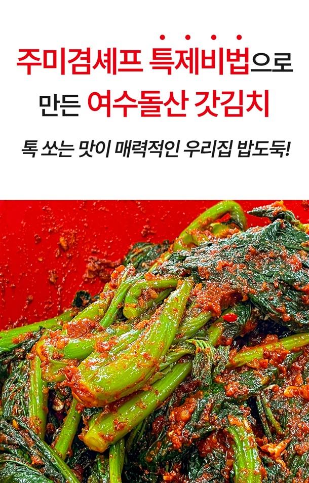 갓(국내산)70%, 꽃게육수5%, 고추가루(국내산,중국산(해썹))5%, 새우(베트남산)2%, 마늘(국내산)1%, 생강(국내산)1%, 양파(국내산)2%, 액젓(국내산)1%, 과당3%, 사과4%, 당근(국내산,수입산)1%, 무(국내산)3%, 청양고추(국내산),천일염(호주산)1% |