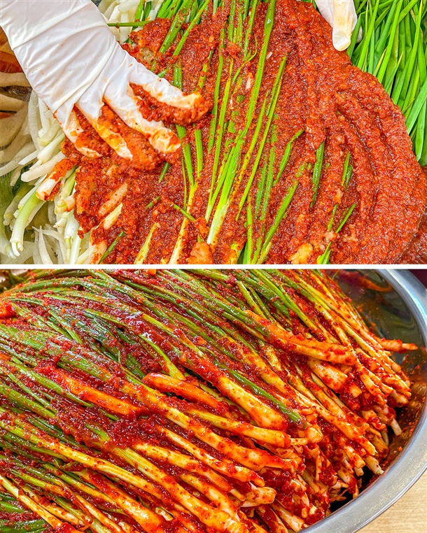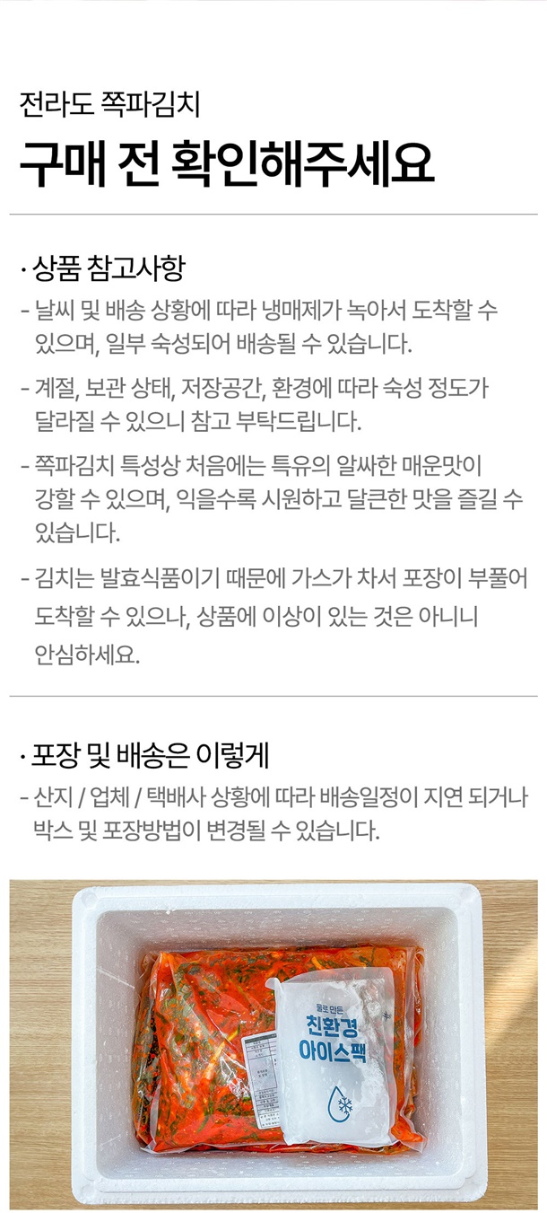 파(국내산)60%, 고춧가루(국내산)12%, 무채(국내산)8%, 건고추(국내산)4%, 까나리액젓4%[까나리(국내산)65%,잡어10%,식염(국내산)25%], 식염(국내산), 양파(국내산), 무(국내산), 다시마, 디포리(국내산), 대파(국내산), 찹쌀(국내산), 새우젓(국내산), 마늘(국내산), 생강(국내산) [새우 함유] |