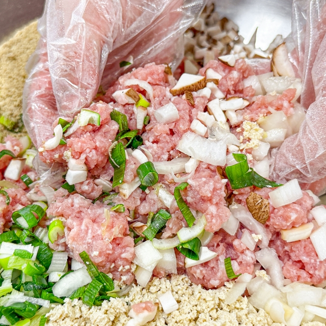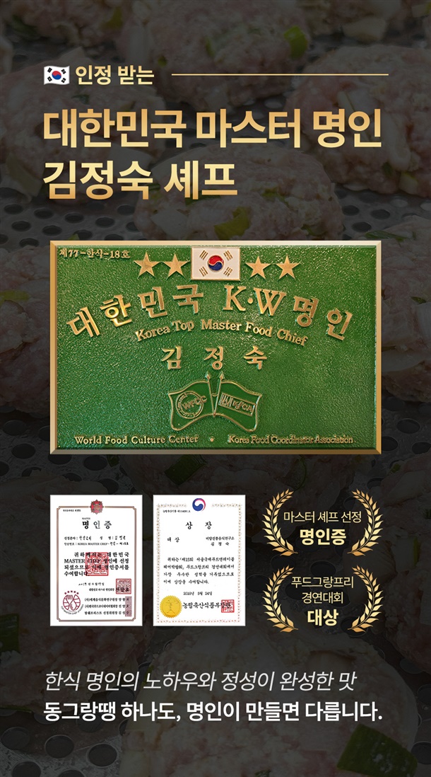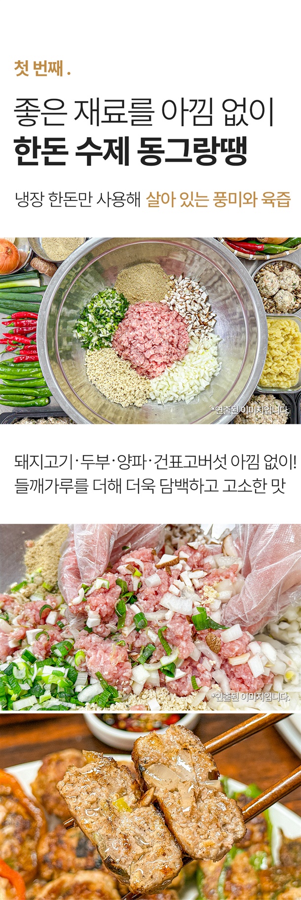 돼지고기(국내산)40%,두부[대두99.1%(외국산:미국,중국,캐나다)]15%,양파(국내산)10%,대파(국내산),다진마늘,참기름,복합조미식품,건표고버섯,감자전분,정제소금,들깨가루,후추가루 |
