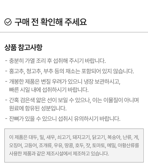 ㆍ직사광선이 들지 않는 서늘한 곳에 보관해 주세요. ㆍ섭취 전 제품이 팽창되어 있을 경우, 섭취하지 마세요. ㆍ안전사고에 유의하시고 조리 과정을 잘 살피십시오. ㆍ개봉한 제품은 변질 우려가 있으니 냉장 보관하시고, 빠른 시일 내에 섭취하시기 바랍니다. ㆍ제품의 양, 조리 기구, 조리 방법에 따라 조리시간이 다를 수 있습니다. ㆍ이 제품은 대두, 밀, 새우, 쇠고기, 돼지고기, 닭고기, 복숭아, 난류, 게, 오징어, 고등어, 조개류, 우유, 땅콩, 호두, 잣, 토마토, 메밀, 아황산류를 사용한 제품과 같은 제조시설에서 제조하고 있습니다. ㆍ잔뼈가 있을 수 있으니 섭취시 유의하시기 바랍니다. ㆍ간혹 검은색 얇은 선이 보일 수 있으나, 이는 이물질이 아니며 원료에 함유된 성분입니다.