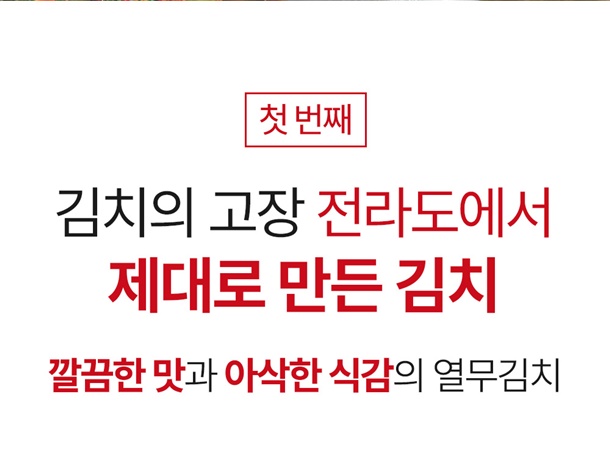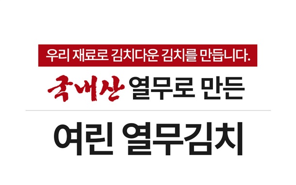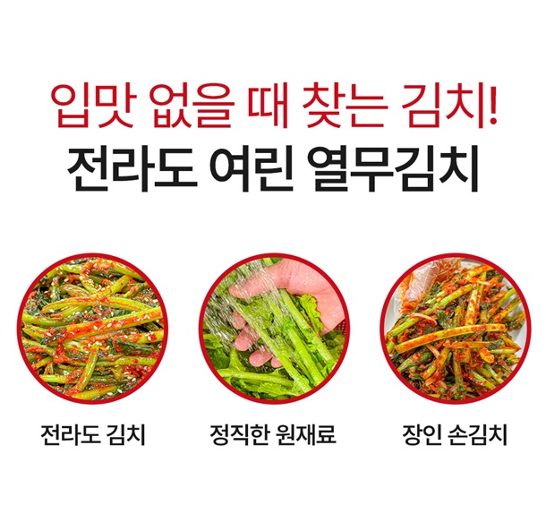 절임열무77%[열무(국산)98%,정제소금(국산)2%], 정제수7.8%, 무3.4%(국산), 고춧가루3%(건고추:국산), 알파미분(쌀:국산), 새우젓(새우:국산), 마늘(국산), 양파(국산), 멸치젓(멸치:국산), 건고추(국산), 멸치액젓(멸치:국산), 요리엿, 천일염(국산), 다시마분말(다시마:국산) *알레르기 유발물질 : 새우 함유 |