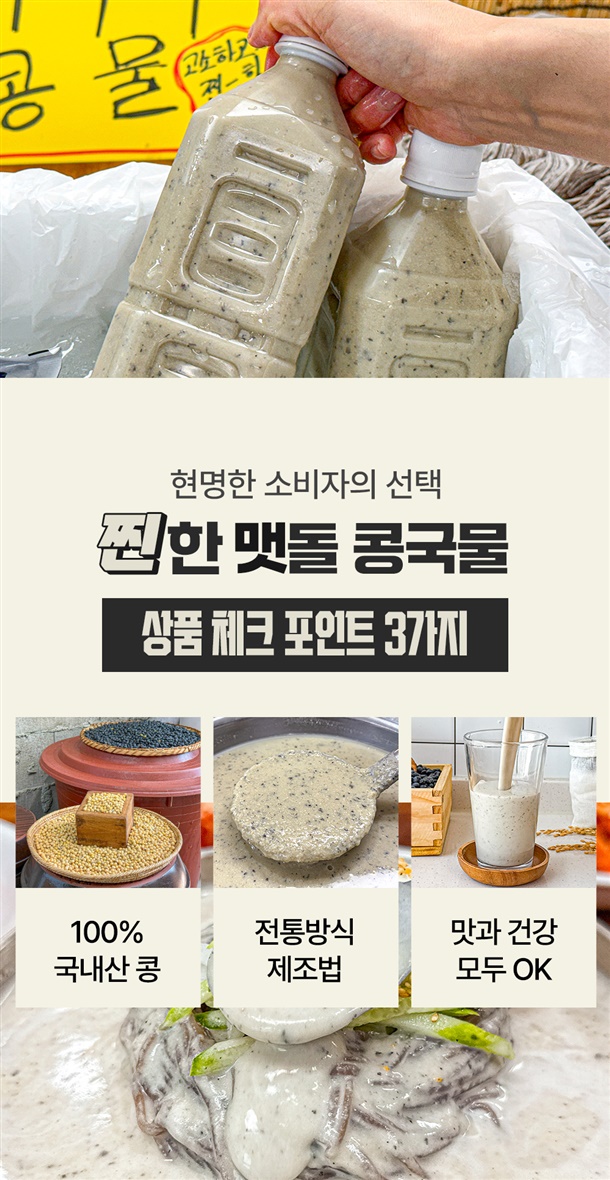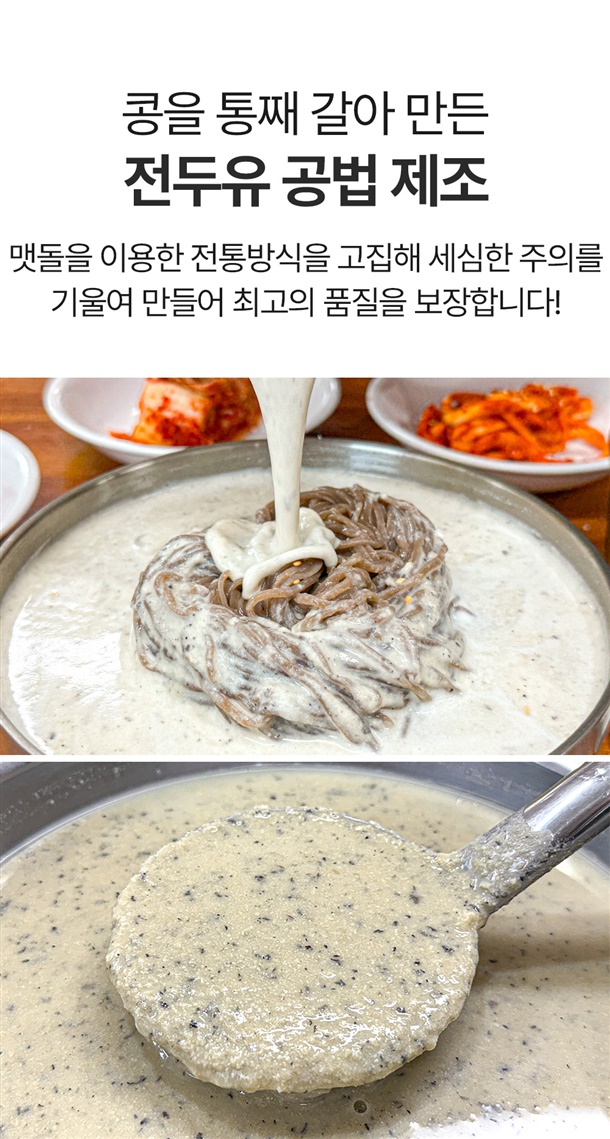 | 소비기한 | 검은콩콩물 : 봉합부 표시일까지/(냉장)제조일로부터 14일, (냉동): 제조일로부터 1년 / 생소면 : 별도 표기일까지/제조일로부터 90일 / 생메밀면사리 : 별도 표기일까지/제조일로부터 90일 |