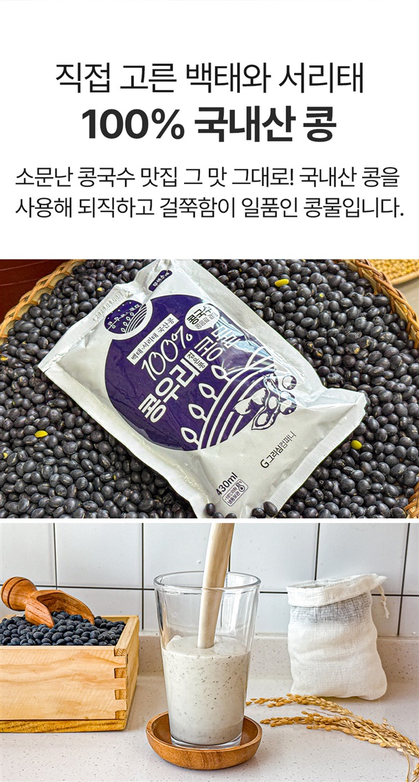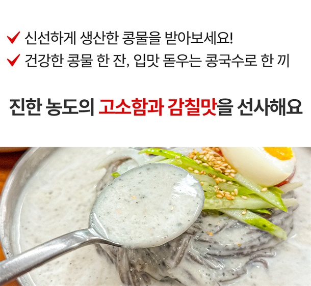 | 원재료명 및 함량 (원산지) | 검은콩콩물 : 대두(국산)79.6%, 검정콩(국산)20%, 정제염0.4% (정제수 제외한 원재료 배합) / 생소면 : 밀가루(밀:미국산,호주산), 옥수수전분{옥수수:외국산(미국산,러시아산,헝가리 등)}, 정제소금(국산), 감자전분, 혼합제제(산도조절제,유화제), *밀 함유 / 생메밀면사리 : 밀가루(밀:미국산,호주산), 메밀가루(중국산)33%, 옥수수전분{옥수수:외국산(미국,러시아,헝가리 등)}, 감자전분, 주정, 정제소금,혼합제제(산도조절제,유화제) *밀,메밀 함유 |