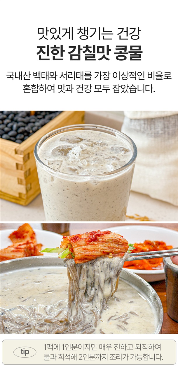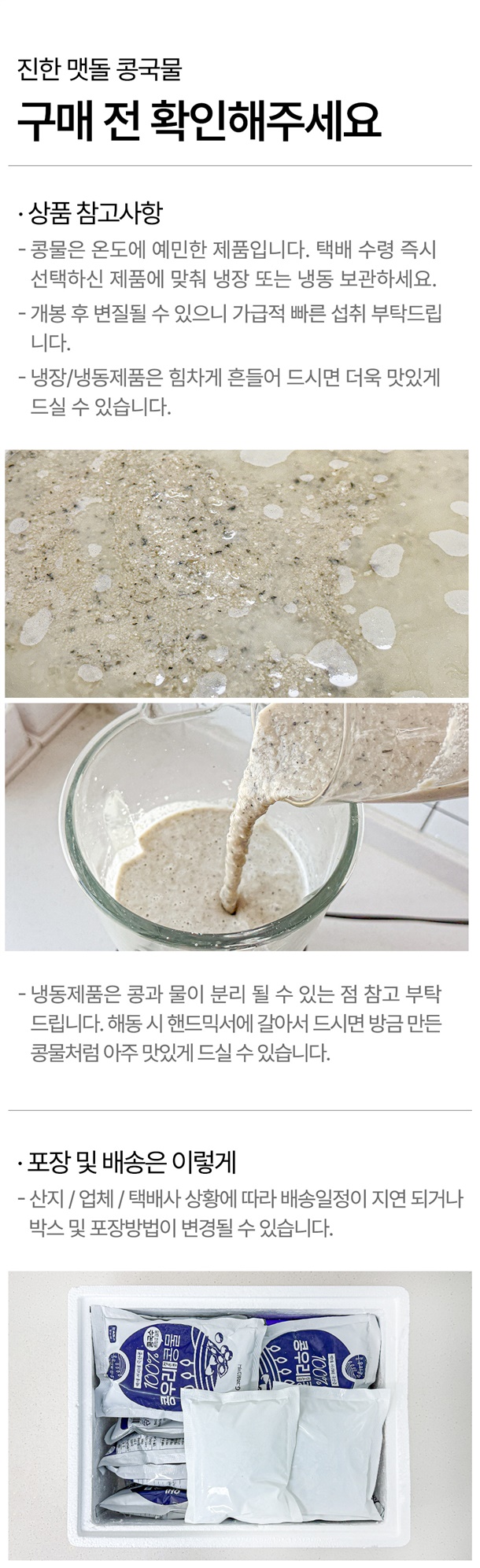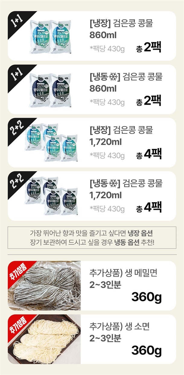 | 상품구성 및 내용량 | (냉장/냉동) 검은콩 콩물 430ml*2팩, (냉장/냉동) 검은콩 콩물 430ml*4팩, 생소면 360g |
