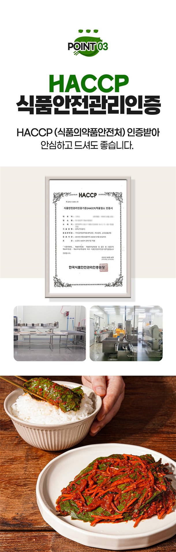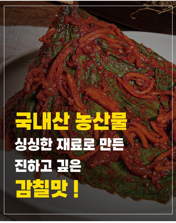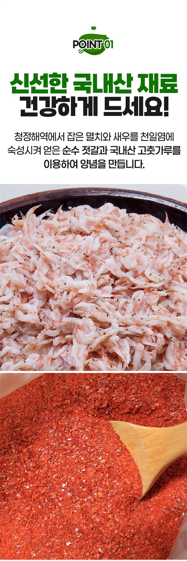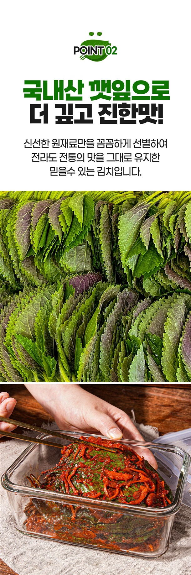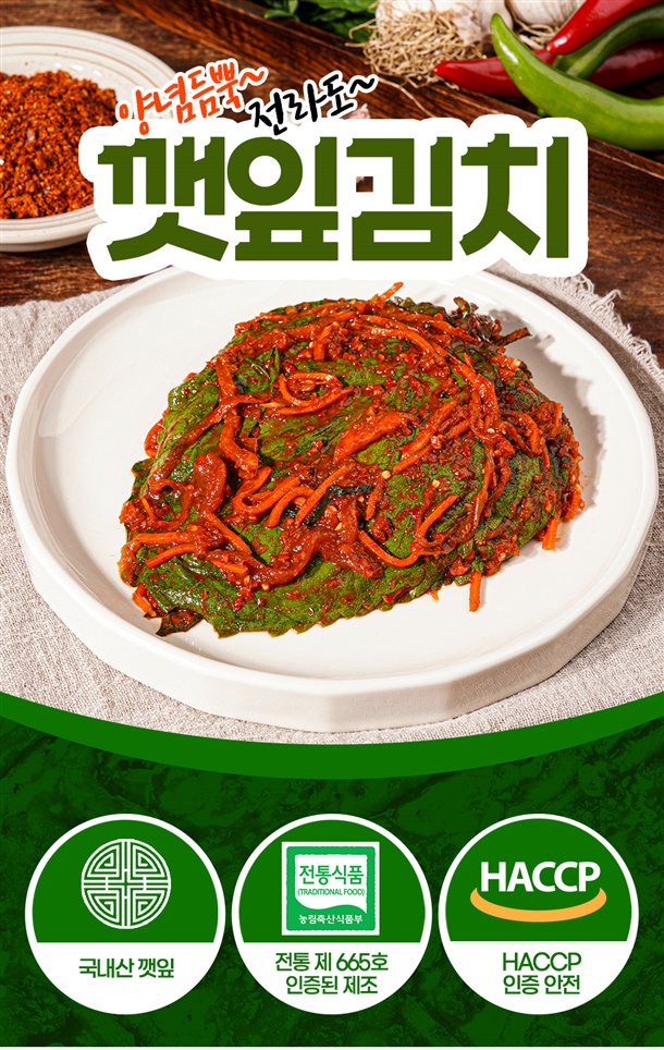 들깻잎60%(국산),육수(국산(다시마,양파,무,표고버섯,불볼락))9.5%,당근(국산)4.5%,양파5%(국산),고춧가루1.2%(국산),건고추(국산)5.2%,멸치젓(국산)1.8%,마늘(국산),밥류(국산(맵쌀)),생강(국산),젓갈(국산,새우젓100%),액젓(국산,멸치액젓100%),무채(국산),실파(국산),사과(국산),청각(국산),설탕,참기름,무(국산) *새우 함유 |