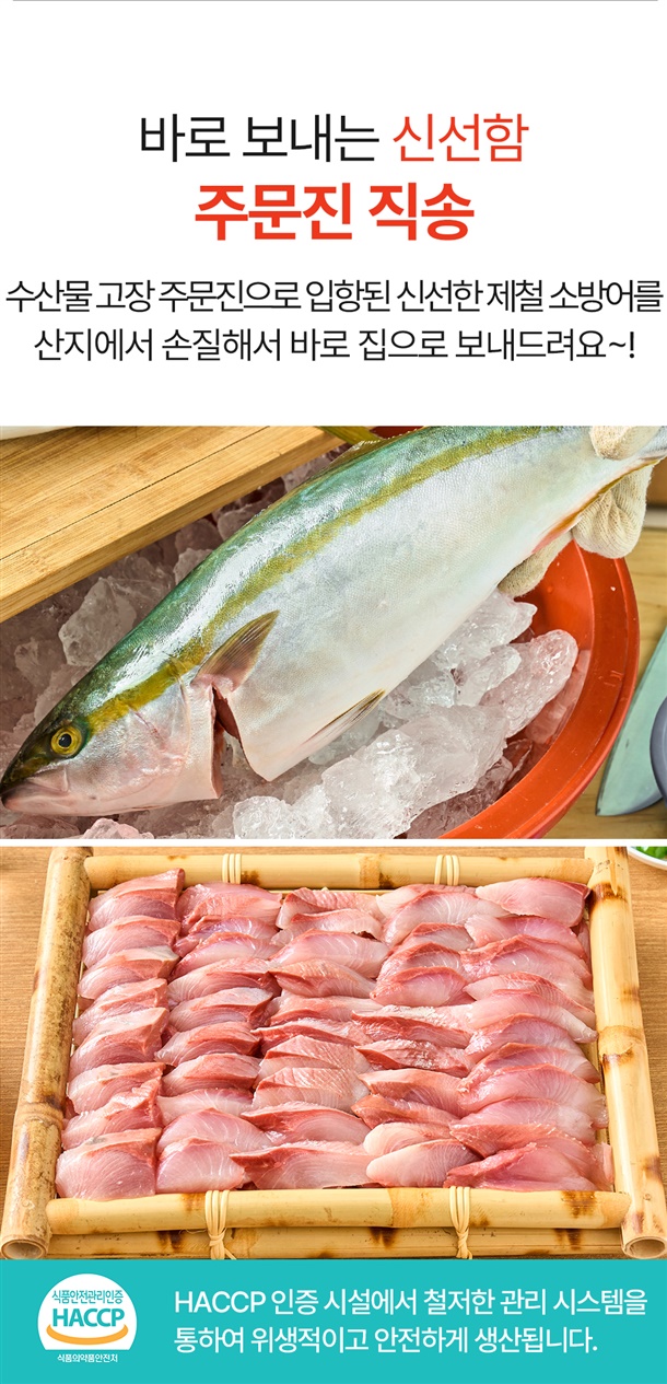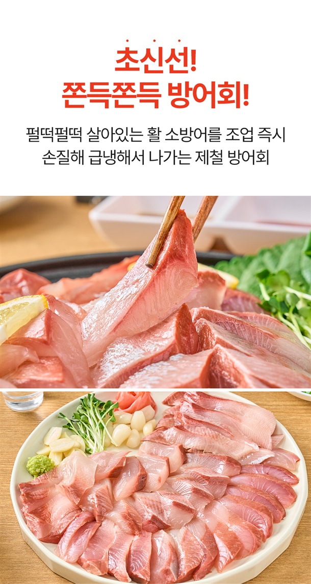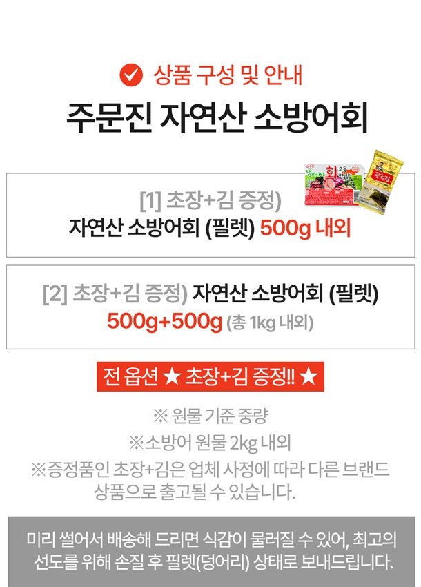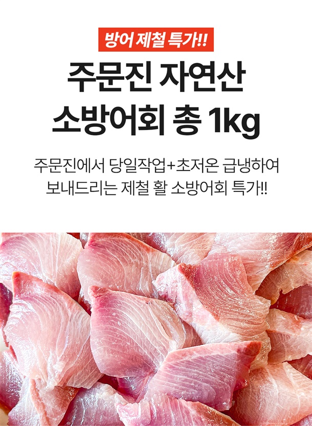 소방어회 500g 내외+생와사비회모듬양념장 120g+3대째 달인 미니 광천김 2g / 소방어회 1kg(500g+500g) 내외+생와사비회모듬양념장 120g+3대째 달인 미니 광천김 2g |