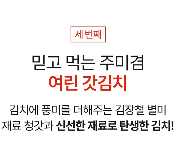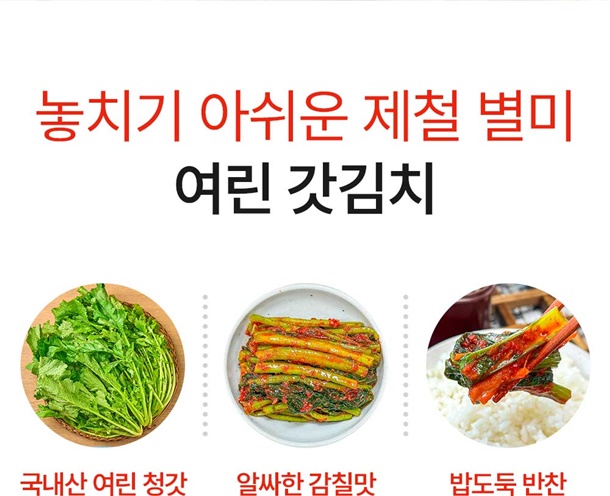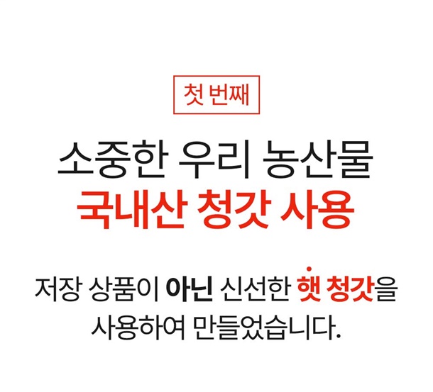 갓(국내산)70%, 꽃게육수5%, 고춧가루(국내산40%,중국산(해썹)60%)5%, 새우(베트남산)2%, 마늘(국내산)1%, 생강(국내산)1%, 양파(국내산)2%, 액젓(국내산)1%, 과당3%, 사과4%, 당근(국내산40%,중국산60%)1%, 무(국내산)3%, 청양고추(국내산)1%, 천일염(호주산)1% |