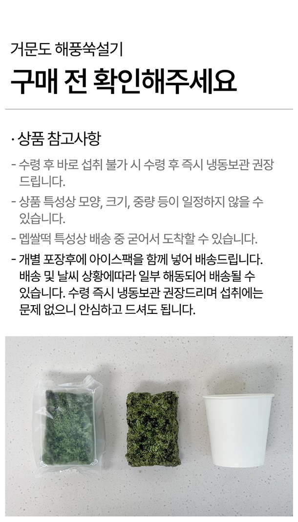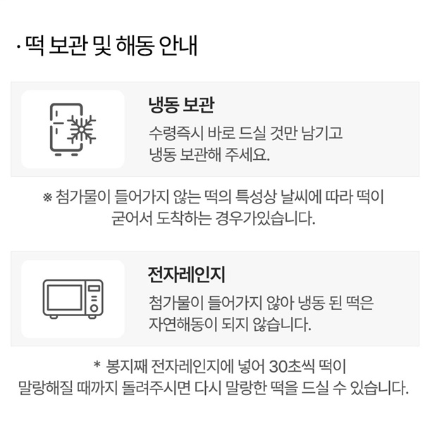 · 상품 수령 즉시 냉동 보관 부탁드립니다. · 해동 후 다시 냉동하지 마시길 바랍니다. |