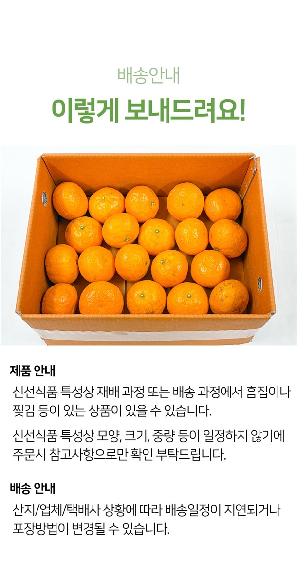 - 배송일 지정은 불가하며 산지에서 순차적으로 출고됩니다. 배송 메시지는 배송 시 택배기사에게 전달되는 사항으로 날짜가 기재 되어있어도 지정일 배송이 어렵습니다.