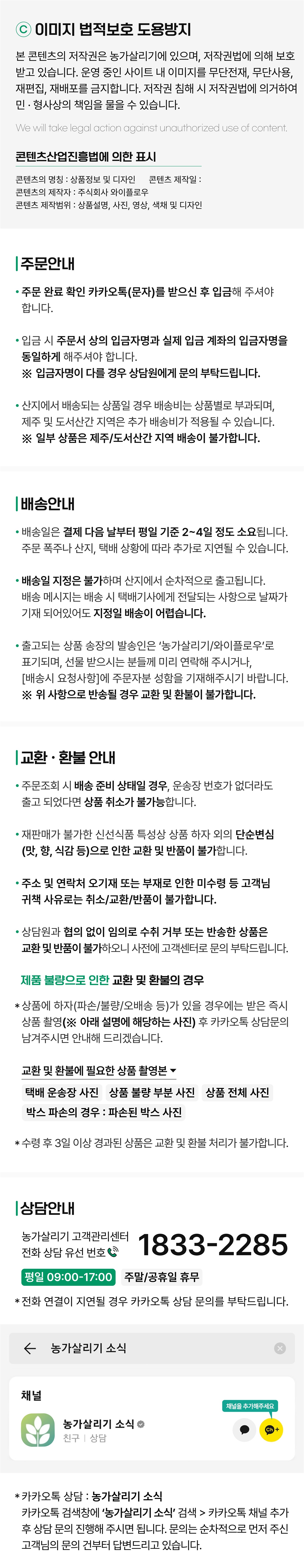 - 재판매가 불가한 신선식품 특성상 상품 하자 외의 단순변심(맛, 향, 식감 등)으로 인한 교환 및 반품이 불가합니다.
