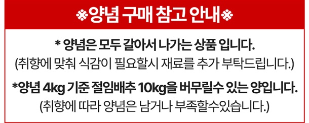 양념은 모두 갈아서 나가는 상품으로 풍성한 식감을 위해서는 다른 제품을 첨가하셔도 됩니다. / 8KG 기준 절임배추 20KG 버무릴수 있는양입니다. (사용자의 한포기 버무리는 양에 따라 포기수는 상이할수 있습니다.) / 상세페이지 안내문 필독 부탁드립니다. |