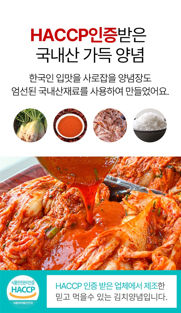 고추가루(국산),무우(국산),생강,양파,물엿,멸치액젓,설탕,새우젓,찹쌀풀,제재염,L-글루타민산나트륨(향미증진제),육수(다시다,마시마,건새우,건멸치,녹차),마늘,새우함유 |
