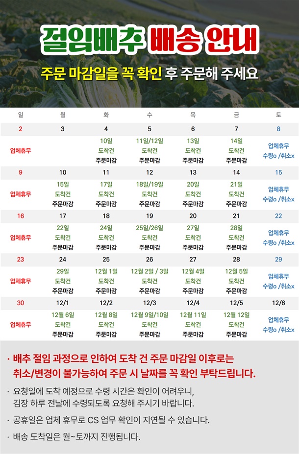 김장 하루전 부터 물빼기 시작하면 갈변이 이뤄집니다. 김장 3시간전부터 물빼는것을 권장드립니다. / 하루전에 물을빼서 갈변이 생기면 반품대상이 아닙니다. / 상세페이지 안내문 필독 부탁드립니다. |