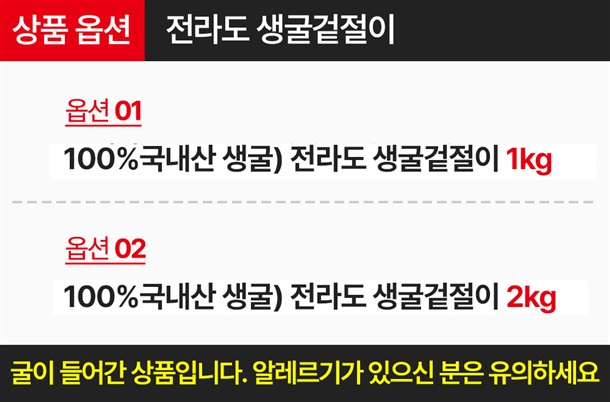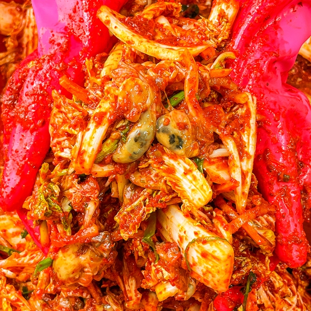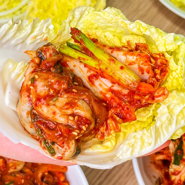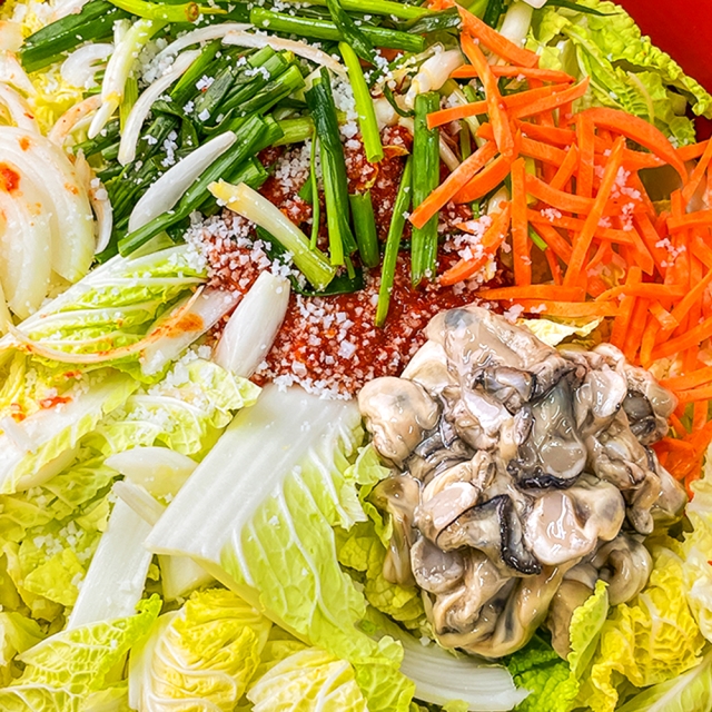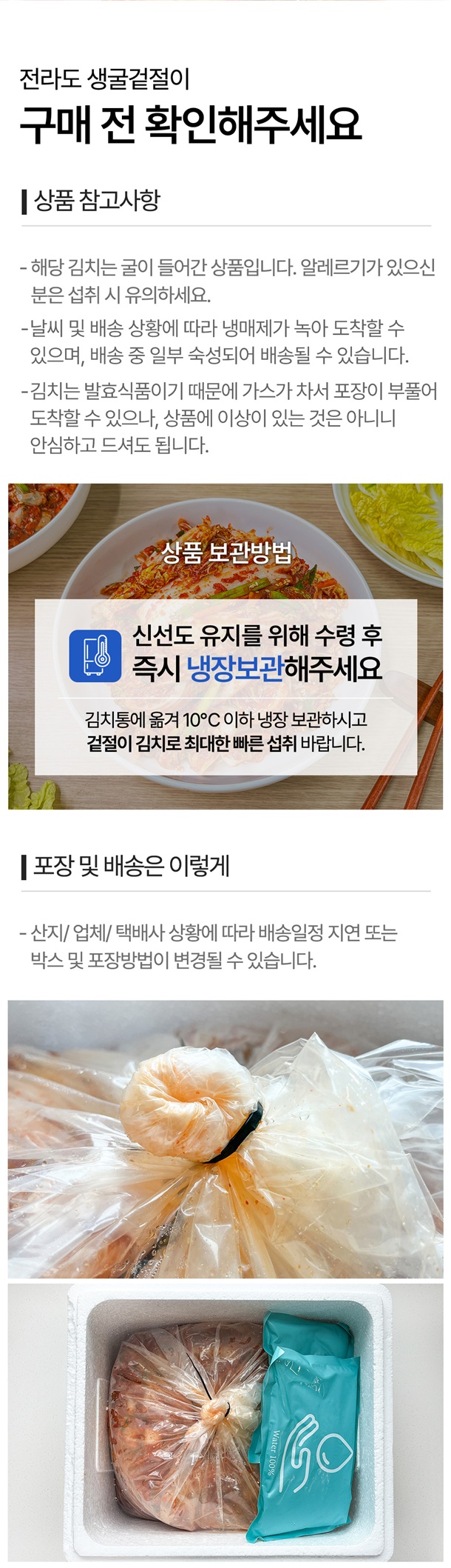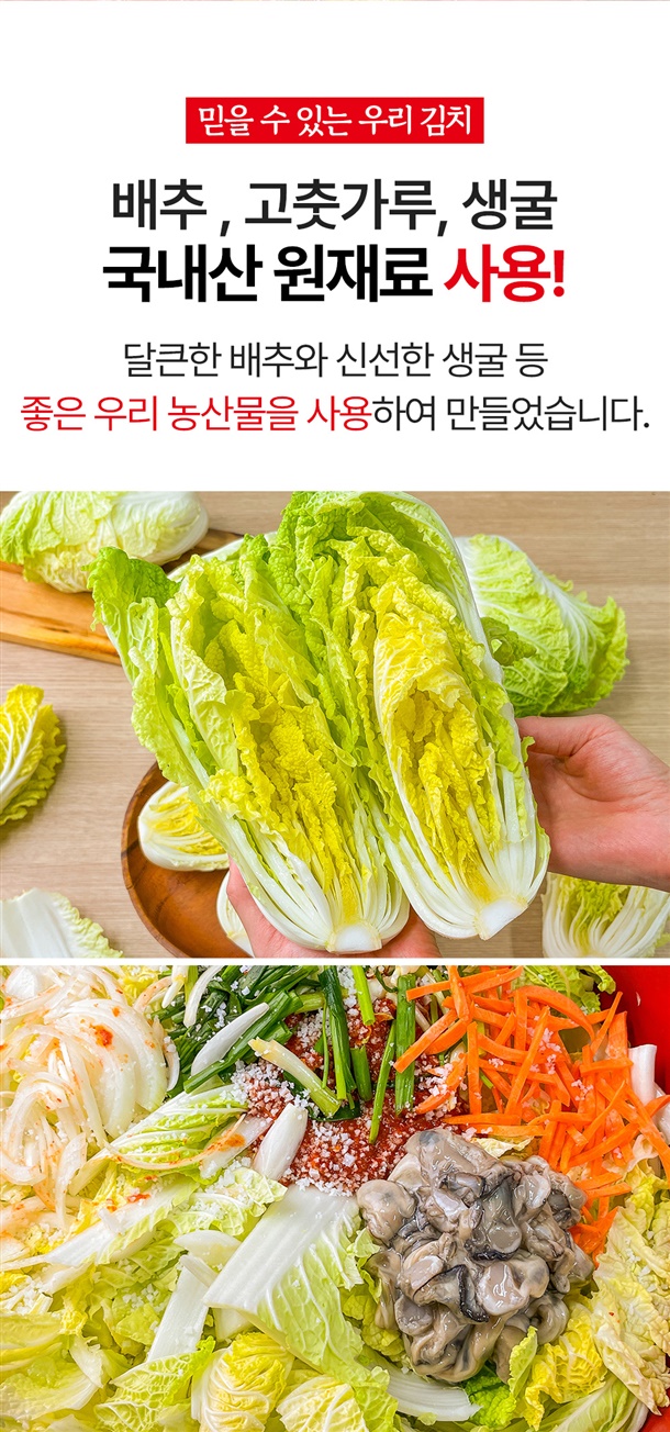 절임배추60%(국내산/배추98%,정제소금2%), 굴(국내산)15.5%, 고춧가루(국내산)4%, 무(국내산), 멸치젓(국내산), 정제수, 새우젓(국내산), 양파(국내산), 마늘(국내산), 쌀풀(국내산), 부추(국내산), 멸치액젓(국내산), 배(국내산), 생강(국내산), 천일염(국내산) *굴, 새우 함유 |