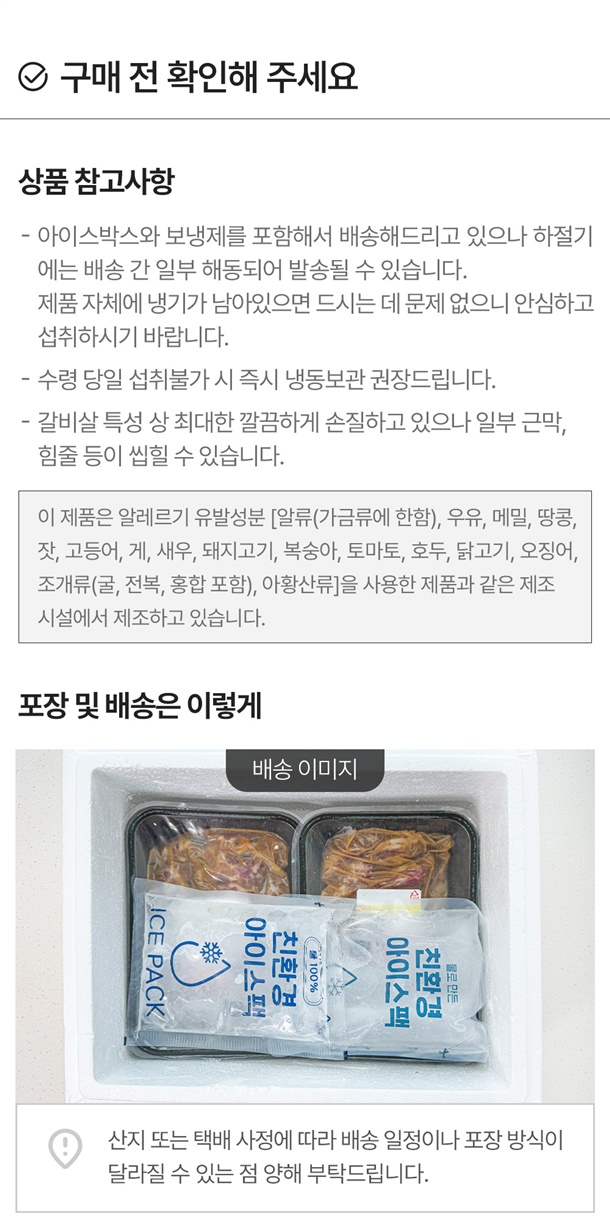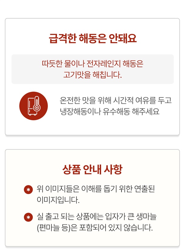 ㆍ함께 포장된 흡습제는 식용이 아니므로 드시지 마십시오. ㆍ이미 냉동된 바 있으니 해동 후 재냉동을 삼가 주십시오. |