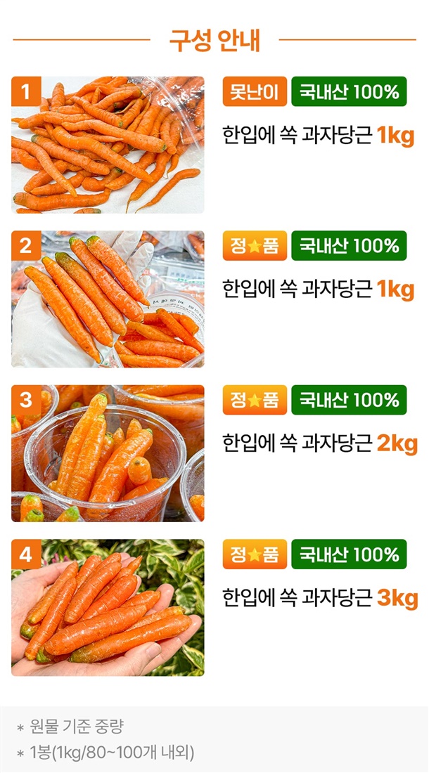 (*1봉: 80~100개 내외) 1kg*1봉, 1kg*2봉, 1kg*3봉(정품) / 1kg(못난이) |