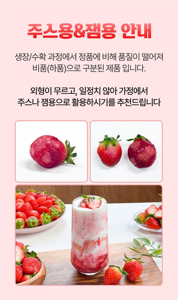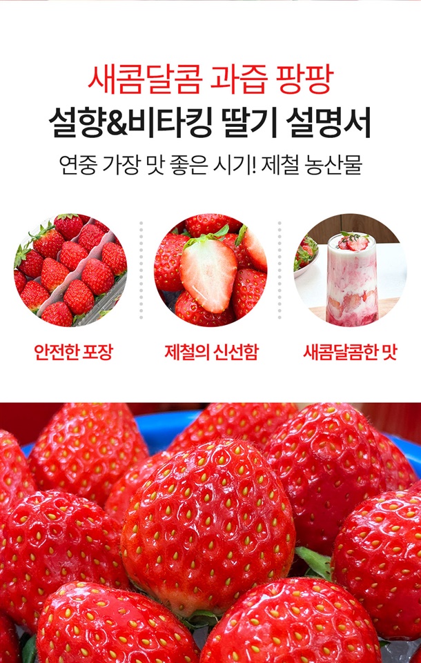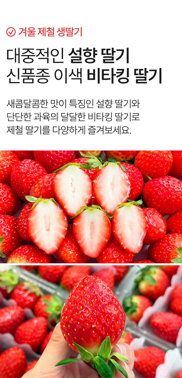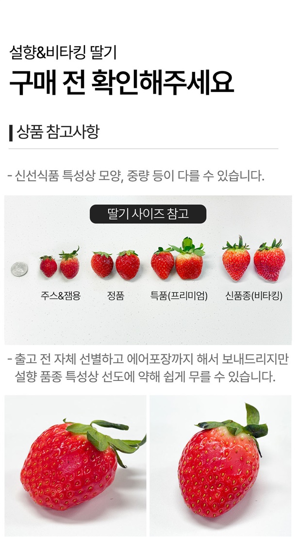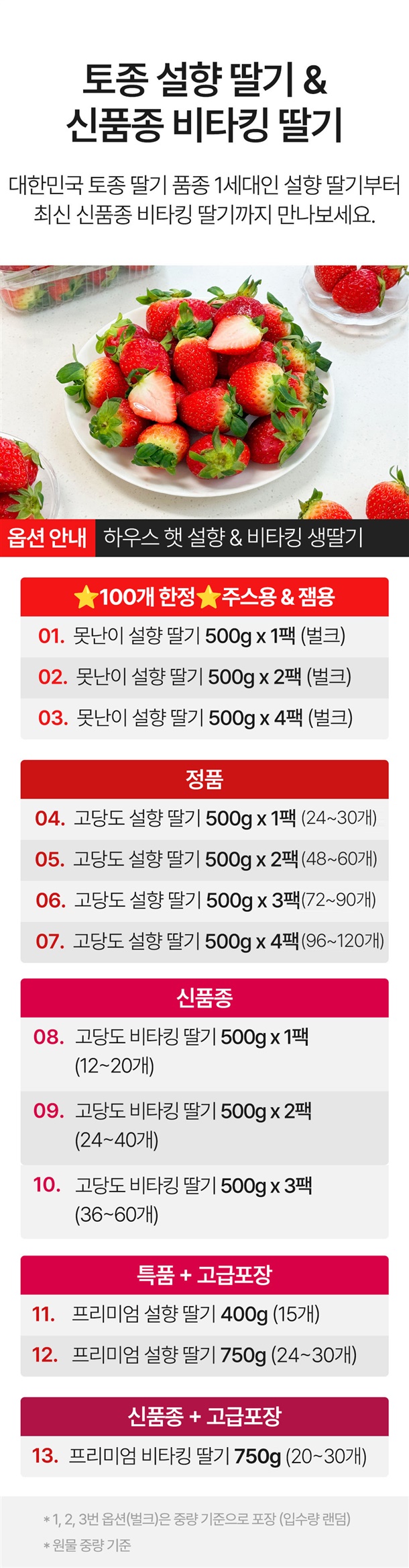 설향 딸기 - (주스용&잼용 / 벌크 : 500g*1팩, 500g*2팩, 500g*4팩),(정품 : 500g*1팩, 500g*2팩, 500g*3팩, 500g*4팩),(특품 : 400g, 750g) / 비타킹딸기 - (신품종 : 500g*1팩, 500g*2팩, 500g*3팩), (고급포장 프리미엄 : 750g) |
