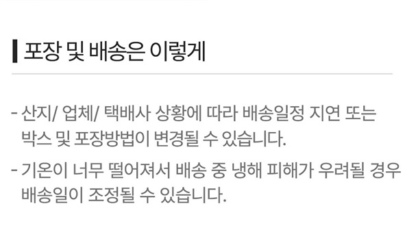 - 배송일 지정은 불가하며 산지에서 순차적으로 출고됩니다. 배송 메시지는 배송 시 택배기사에게 전달되는 사항으로 날짜가 기재 되어있어도 지정일 배송이 어렵습니다.