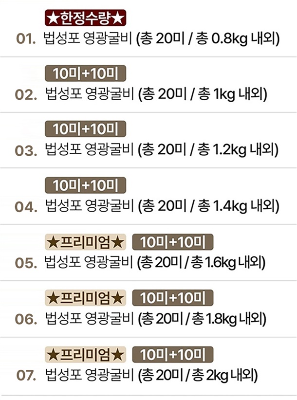 영광굴비 : 20미(총 0.8kg 내외),20미(총 1kg 내외),20미(총 1.2kg 내외),20미(총 1.4kg 내외) / 프리미엄 영광굴비 : 20미(총 1.6kg 내외),20미(총 1.8kg 내외),20미(총 2kg 내외) |