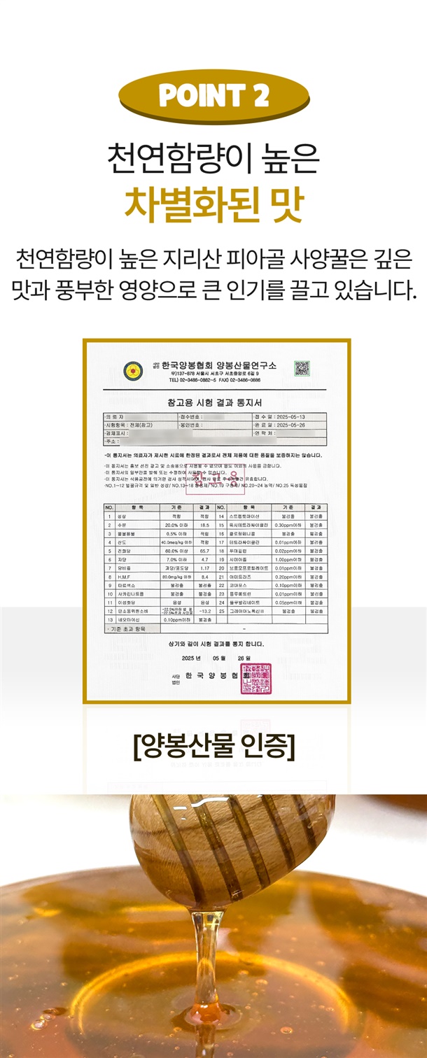 ㆍ이 제품은 꿀벌을 기르는 과정에서 꿀벌이 설탕을 먹고 저장하여 생산한 사양벌꿀입니다. ㆍ만 1세 미만의 영유아에게는 섭취시키지 마십시오. |