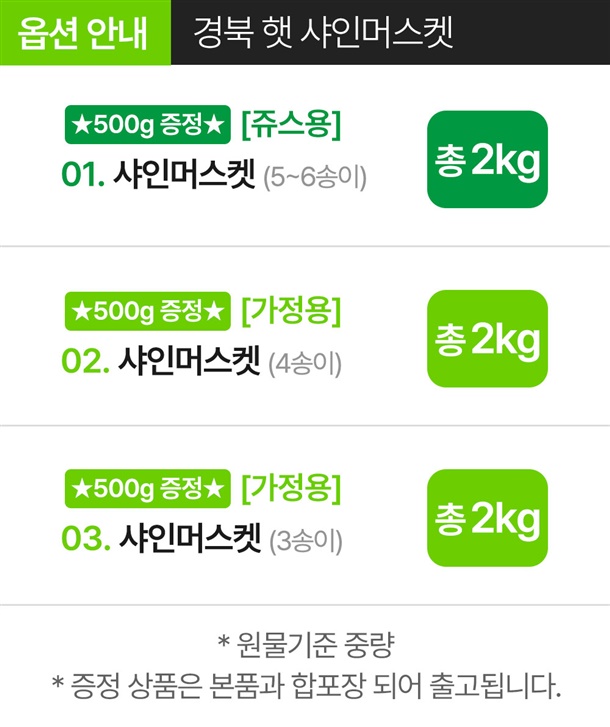 - 배송일 지정은 불가하며 산지에서 순차적으로 출고됩니다. 배송 메시지는 배송 시 택배기사에게 전달되는 사항으로 날짜가 기재 되어있어도 지정일 배송이 어렵습니다.