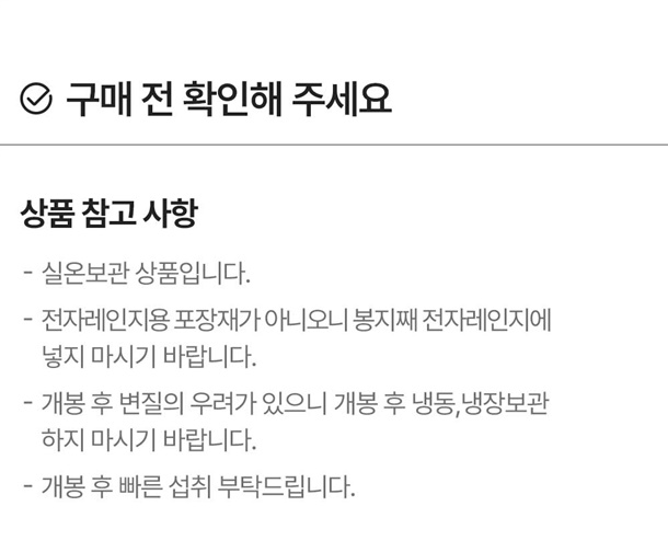 개봉시 손을 베일 위험이 있으니 주의하세요. / 전자레인지용 포장재가 아니오니 봉지째 전자레인지에 넣지 마시기 바랍니다. / 개봉 후 변질의 우려가 있으니 개봉 후 냉동,냉장보관 하지 마시기 바랍니다. / 제품 보관시 직사광선을 피해 서늘한 곳에 보관 바랍니다. / 이동 및 보관 중 포장재가 파손 시 제품이 변질될 수 있습니다. / 본 제품은 난류,대두,밀,우유,메밀,땅콩,잣,고등어,게,새우,돼지고기,닭고기,복숭아,토마토,호두,오징어,조개류(굴, 전복,홍합 포함),아황산류 등을 사용한 제품과 같은 제조시설에서 제조하고 있습니다.