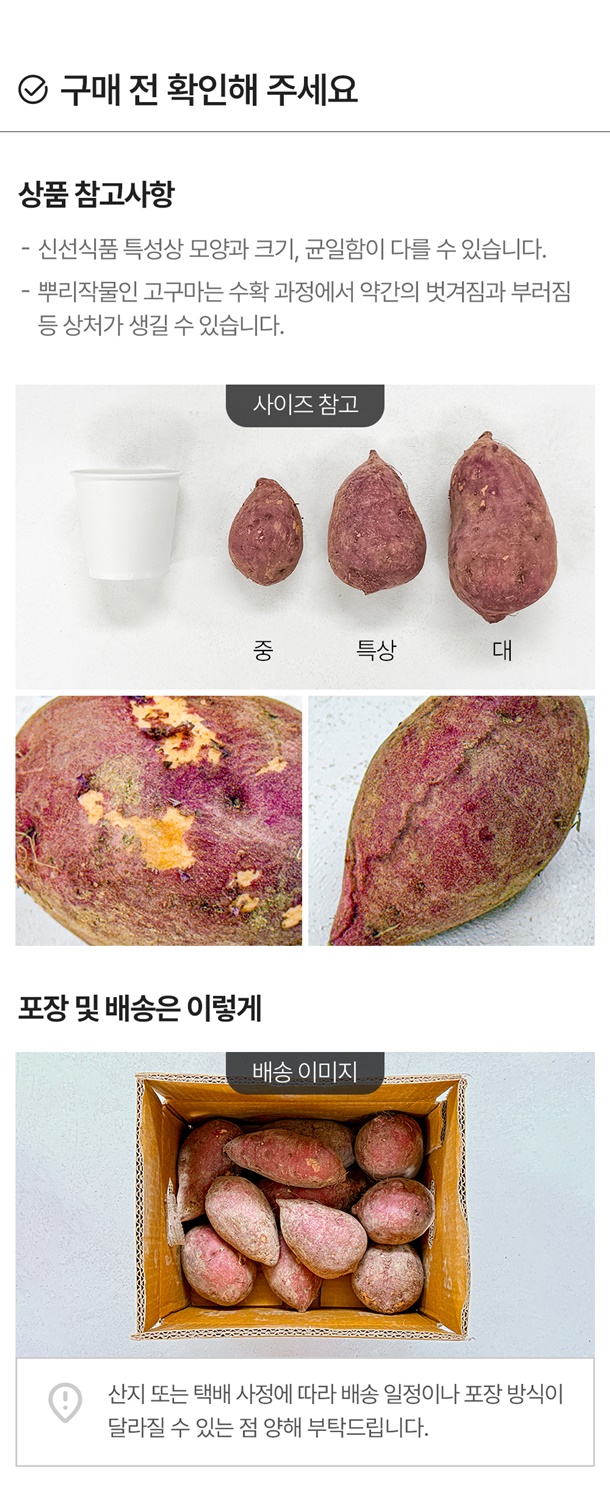 ㆍ고구마는 습기를 제거하지 않으면 금방 상하기 때문에, 택배 수령 시 모두 꺼내서 말린 후에 서늘한 곳에 보관해 주세요. ㆍ신문지로 하나씩 감싸 보관하면 신선도를 더 오래 유지할 수 있습니다. |