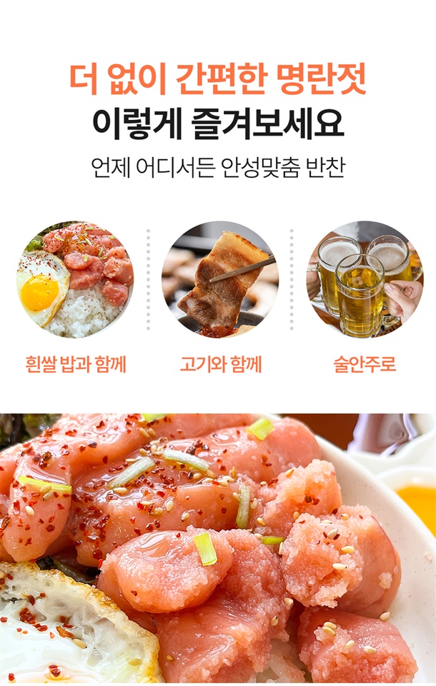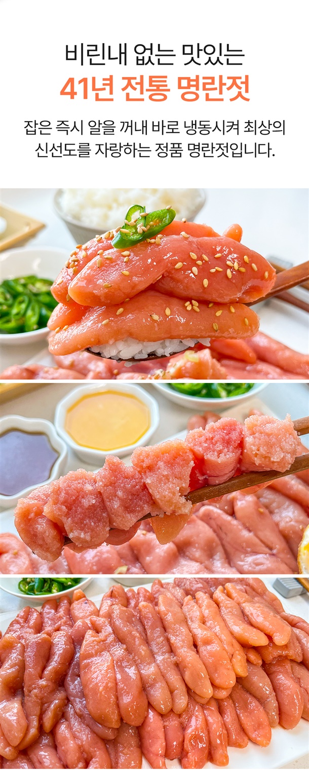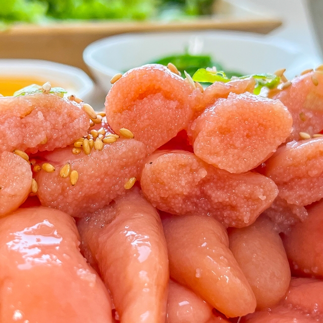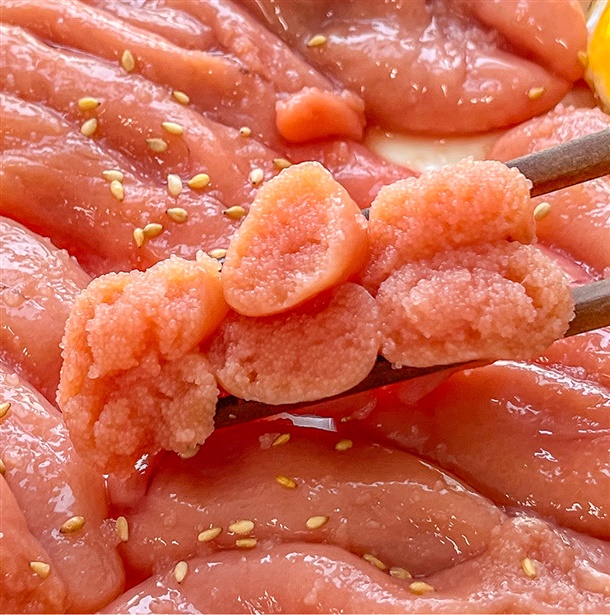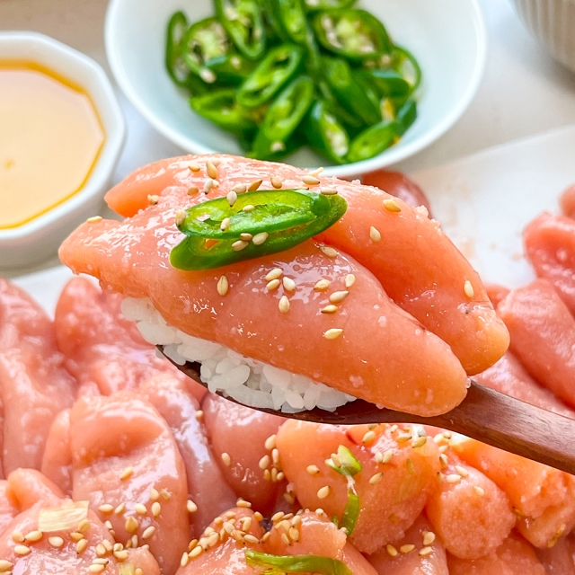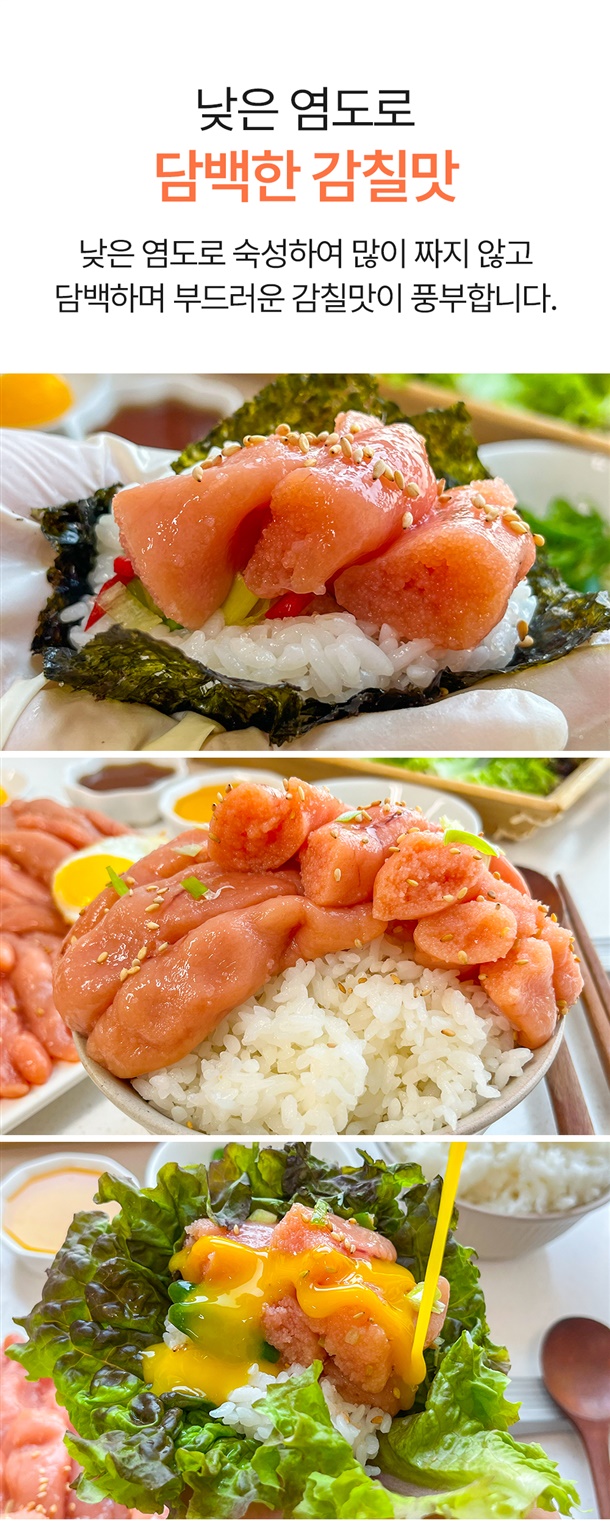 명태알(러시아산)87.3%,정제소금(국내산)2.5%,D-소비톨2.5%,L-글루탐산나트륨[향미증진제],젖산칼슘,dl-사과산나트륨,글리신,니코틴산아미드,L-아스코브산나트륨,청주(쌀:국내산)0.5%,조미액,설탕,소브산칼륨[합성보존료],아질산나트륨[발색제] |