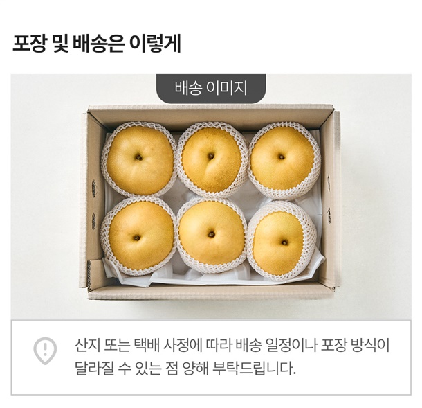 - 배송일 지정은 불가하며 산지에서 순차적으로 출고됩니다. 배송 메시지는 배송 시 택배기사에게 전달되는 사항으로 날짜가 기재 되어있어도 지정일 배송이 어렵습니다.